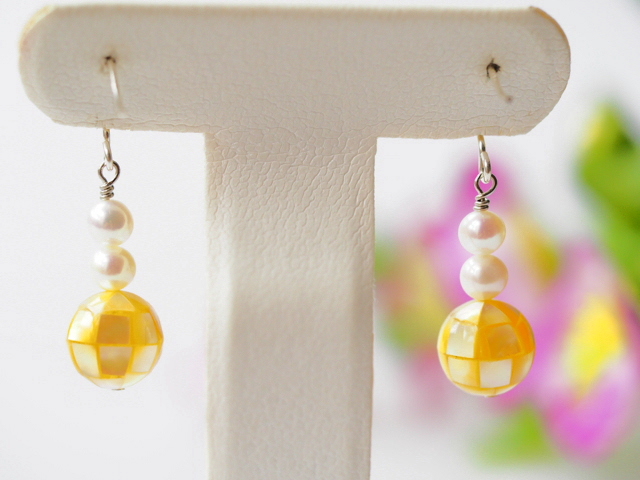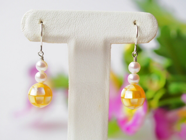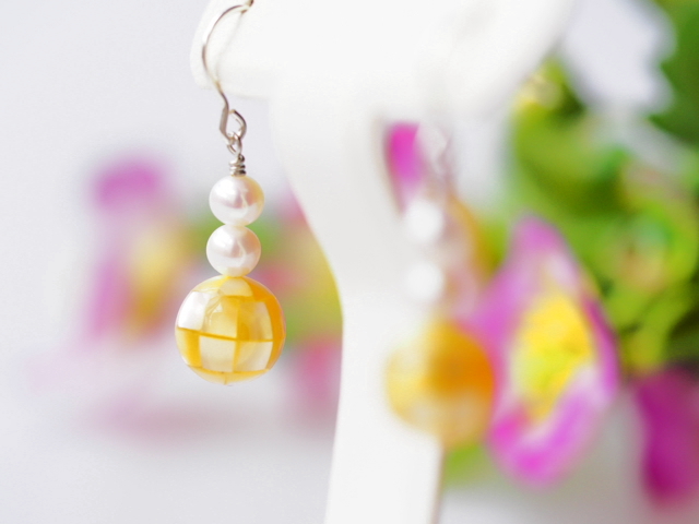 柔らかい模様が魅力的なブラウンシェルに小珠のホワイトパール、肌なじみの良い優しい色味はどんなファッションにも合せ易くピアスです。