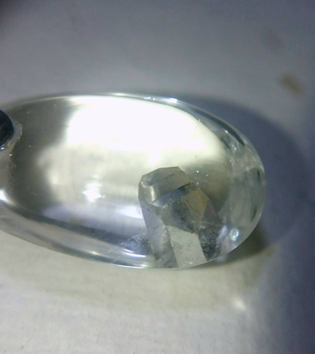 透明度高く非常に輝きの強い水晶。 中に入っている水晶は途中で折れていてファセットはありません。