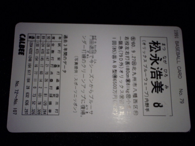 1991 カルビーベースボールカード No79 松永浩美 オリックスブルーウェーブ
