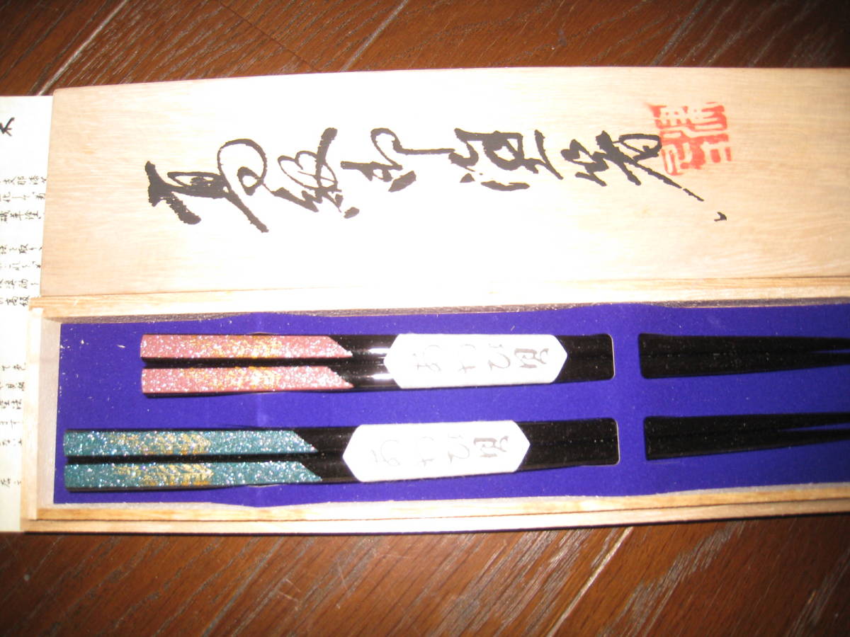 若狭塗の高級夫婦箸セット。黒地に金粉柄、新品箱入り。箸の長さは22.5cmと21cm。重量150g、箱厚み2.2cm、宅配サイズ60。