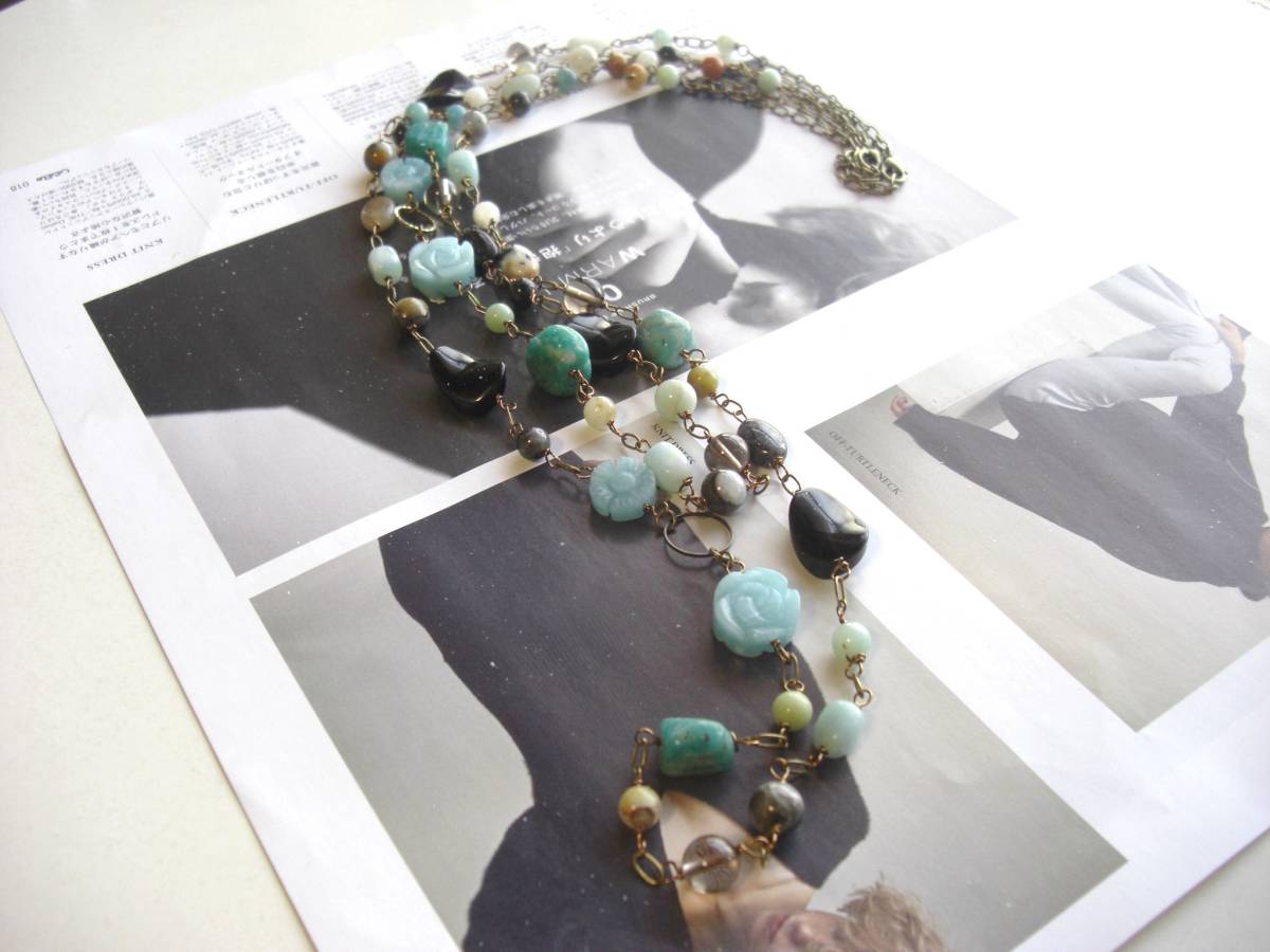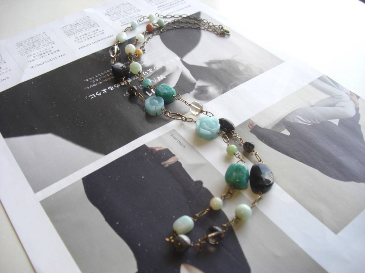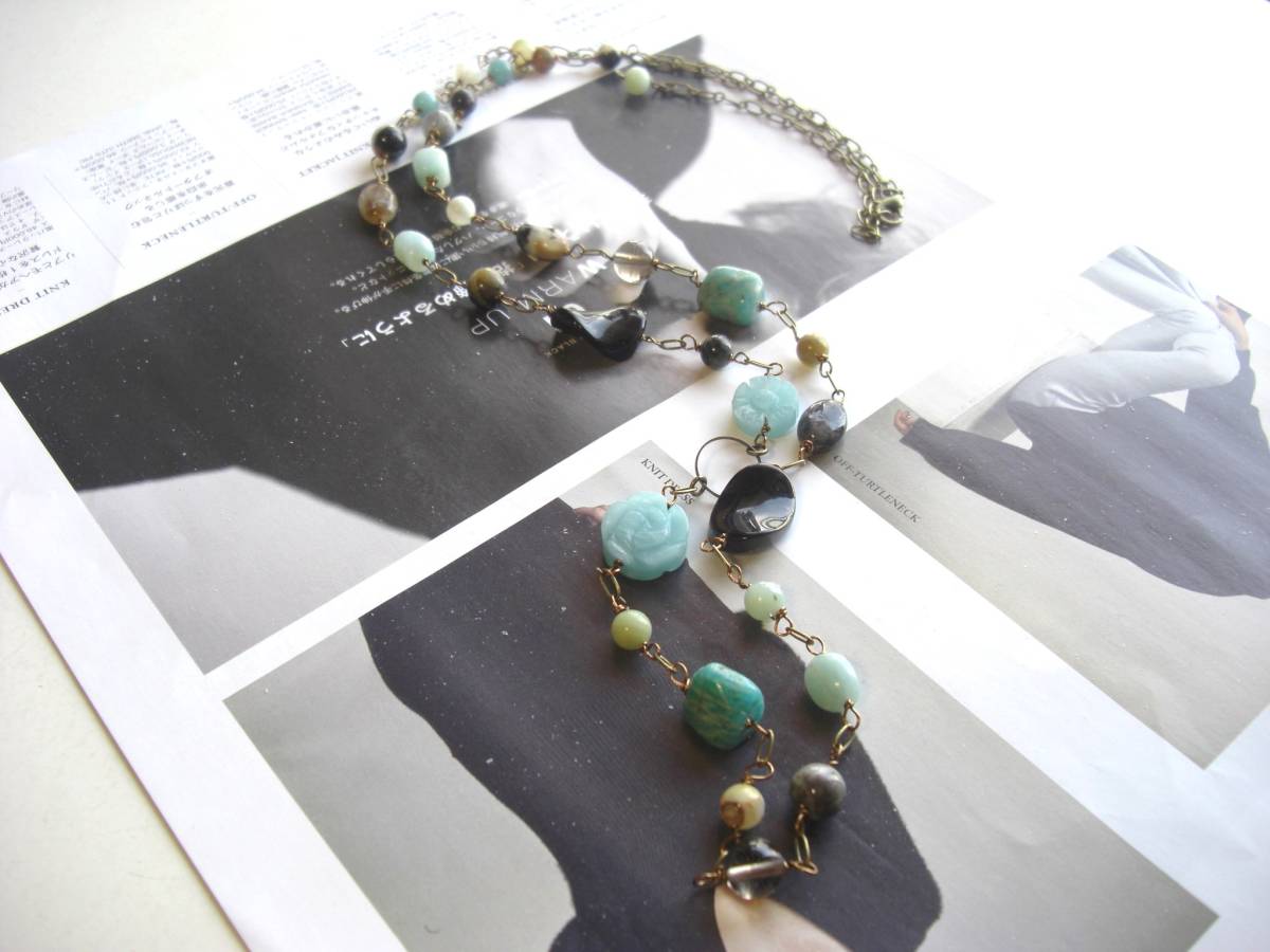 モンローの夢・・シリーズです♪水色の薔薇を繋いで・・ロマンチックなアマゾナイトのネックレス2本セットです♪同じデザインの長さ違いです♪画像のように2連にされたりブレスレットにされたり色々な組み合わせで楽しんでいただけます♪6ミリ、8ミリの丸玉、10ミリ、14ミリの 両面薔薇のアマゾナイトにロシアンアマゾナイトのラフカットやオニキスのオーバルウェーブ、スモーキークォーツの丸玉を合わせて大人のロマンチックしています♪長さ は長い方のネックレスが全長100センチ位で調節自由です♪短い方のネックレスが全長80センチ位で調節自由です♪それぞれ単品やお揃いのブレスレットやピアスも出品しています♪♪シンプルで 飽きのこないいつまでも着けられるデザインを考えて作りました!ハンドメイドをご理解頂いてノークレーム、ノーリターンでお願いします