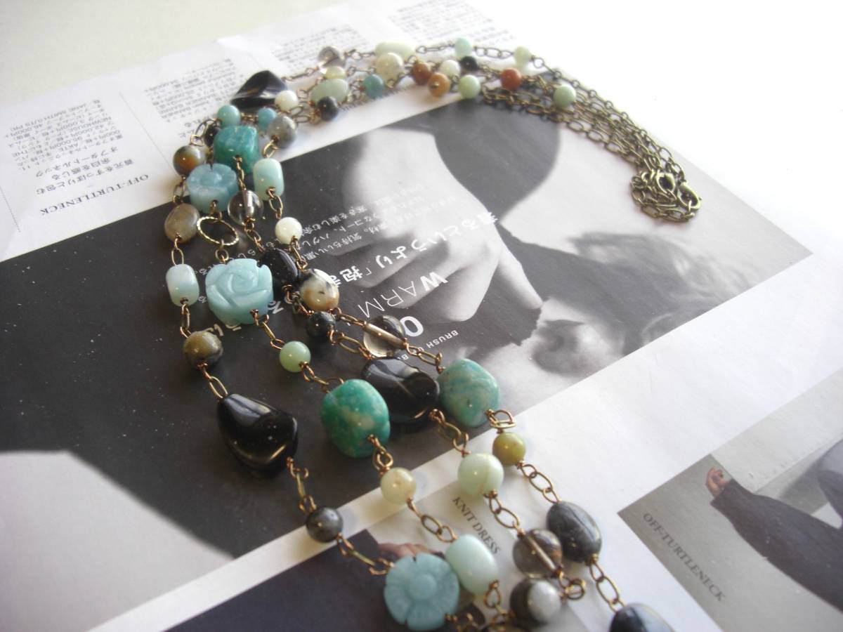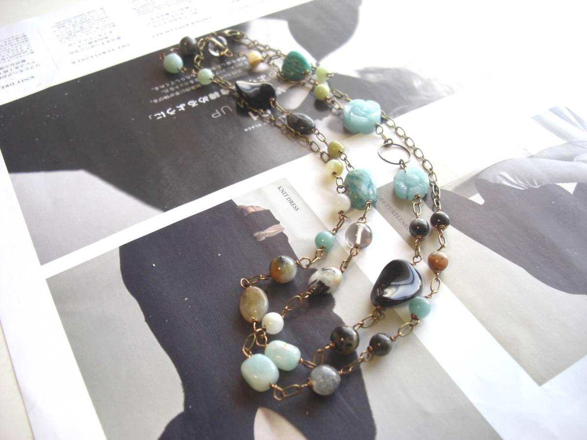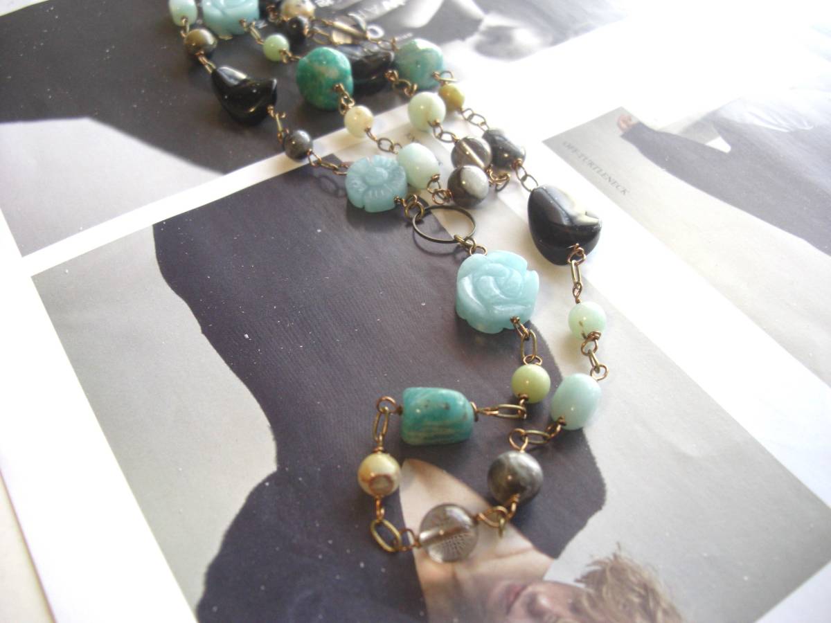 モンローの夢・・シリーズです♪水色の薔薇を繋いで・・ロマンチックなアマゾナイトのネックレス2本セットです♪同じデザインの長さ違いです♪画像のように2連にされたりブレスレットにされたり色々な組み合わせで楽しんでいただけます♪6ミリ、8ミリの丸玉、10ミリ、14ミリの 両面薔薇のアマゾナイトにロシアンアマゾナイトのラフカットやオニキスのオーバルウェーブ、スモーキークォーツの丸玉を合わせて大人のロマンチックしています♪長さ は長い方のネックレスが全長100センチ位で調節自由です♪短い方のネックレスが全長80センチ位で調節自由です♪それぞれ単品やお揃いのブレスレットやピアスも出品しています♪♪シンプルで 飽きのこないいつまでも着けられるデザインを考えて作りました!ハンドメイドをご理解頂いてノークレーム、ノーリターンでお願いします