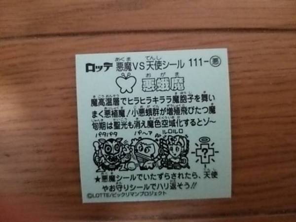 ビックリマン伝説8 悪-111 悪蛾魔 です。状態は写真で判断して下さい。詳しく知りたい方は質問でお願いします。旧ビックリマン、ひかり伝、聖核伝、ビックリマン伝説を大量出品していますので、他もご覧下さい。発送は普通郵便(110円~)のみになります。ノークレームノーリターンでお願いします。