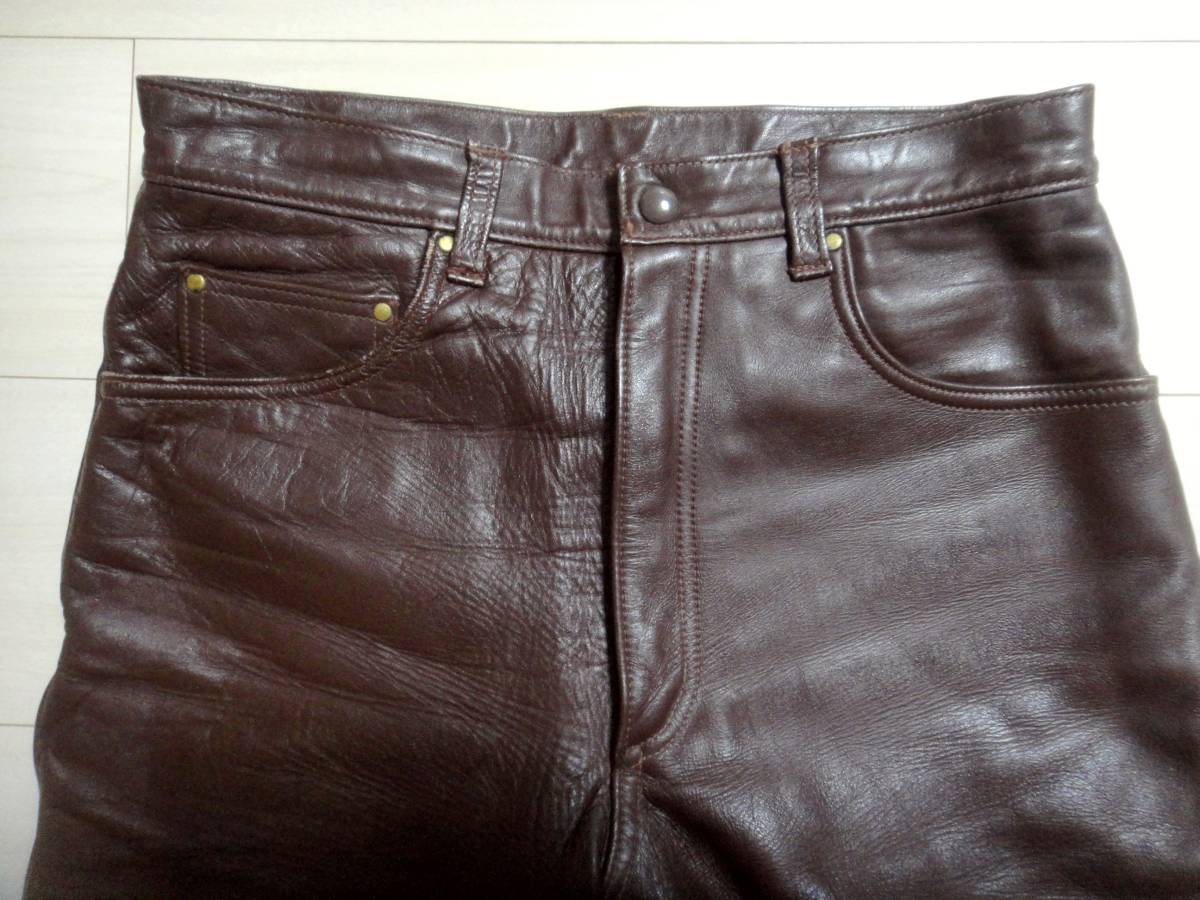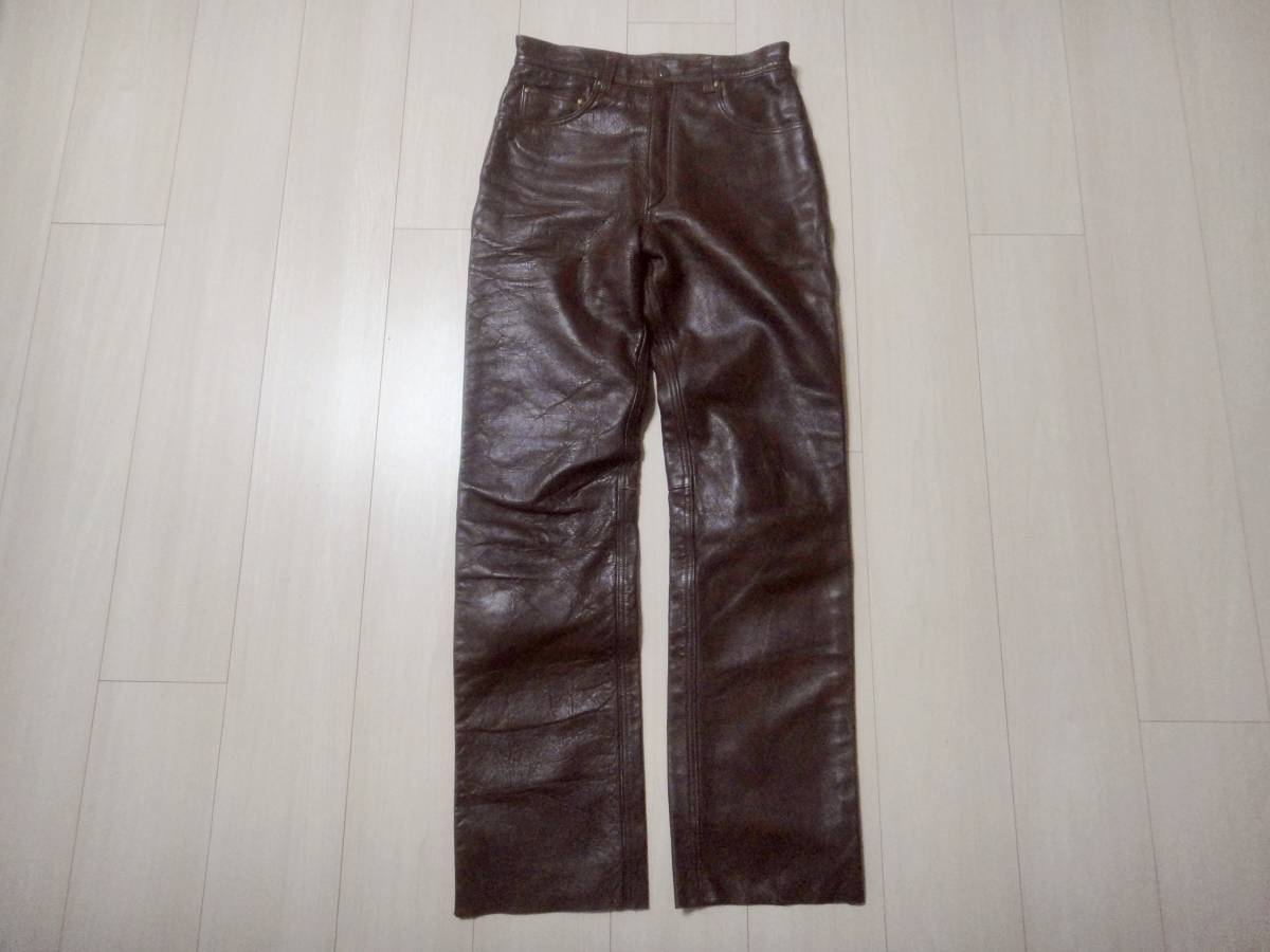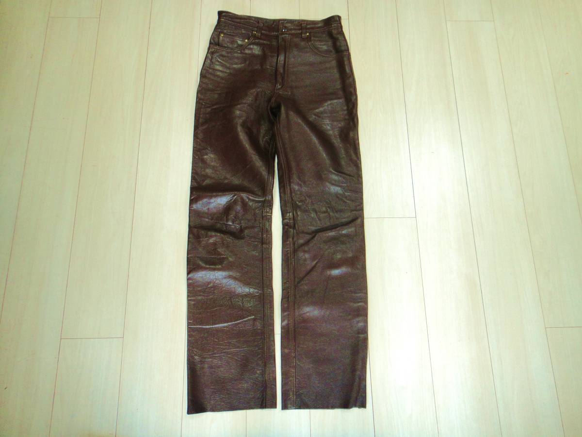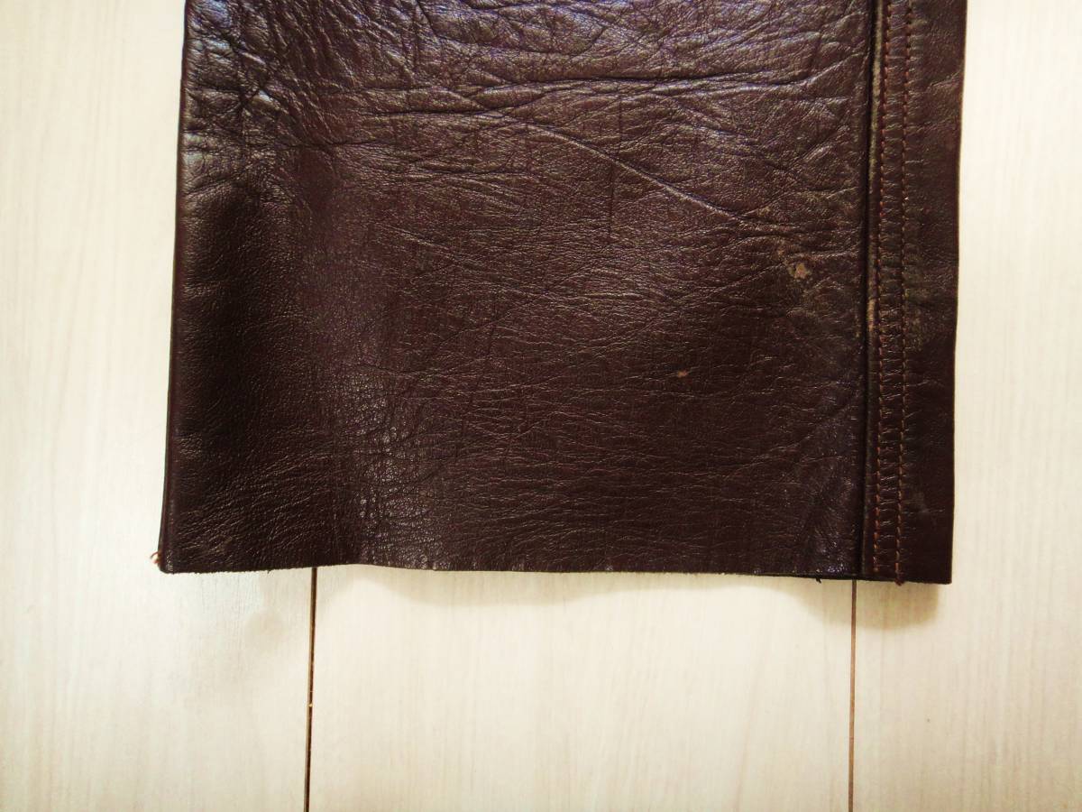 アメリカ、LOST WORLD(ロストワールド)社のレザーパンツです ハイクオリティのレプリカもののクロージングを作っているブランドです ■サイズは30になります ウエスト70㎝台前半くらいの方に合うと思います 素人採寸ですが 股下78㎝ 全丈115㎝ありました また裾の幅は平置きで約20.5㎝、太もも付近は平置きで約26㎝程ありました ■ジーンズ型のスタイルとなっております ■色は茶色になります 写真6.7.8.9.10枚目がより近いカラーとなります ■コットンの裏地が付いております ■裾は切りっぱなしとなっております ■ユーズドになりますので使用感(擦れやシワ等)はありますがまだご使用頂けると思います ■ロストワールドのファンの方いかがでしょうか 是非よろしくお願い致します
