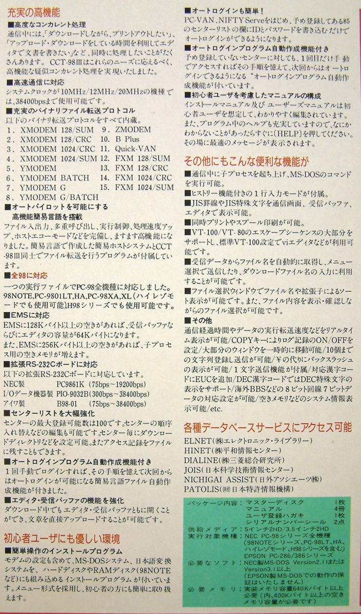 【3286】技術評論社 CCT-98 Ⅲ 通信ソフト プロトコル(XModem YModem ZModem BPlus Quick-VAN FXM) 機種(NEC PC-9800,EPSON PC-286/PC-386)