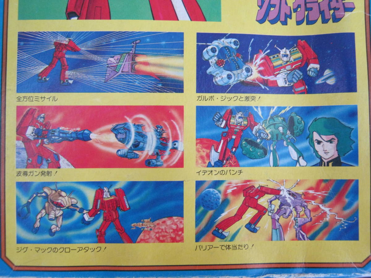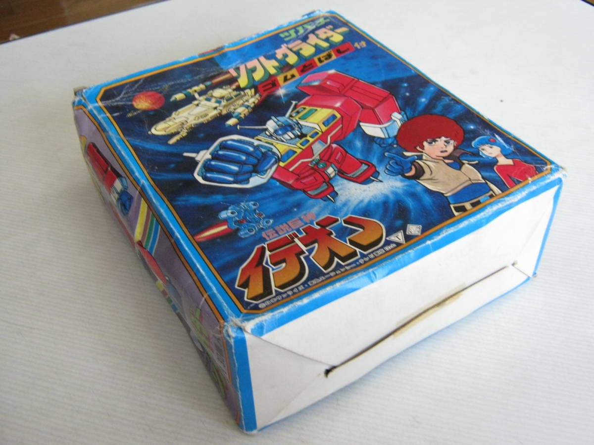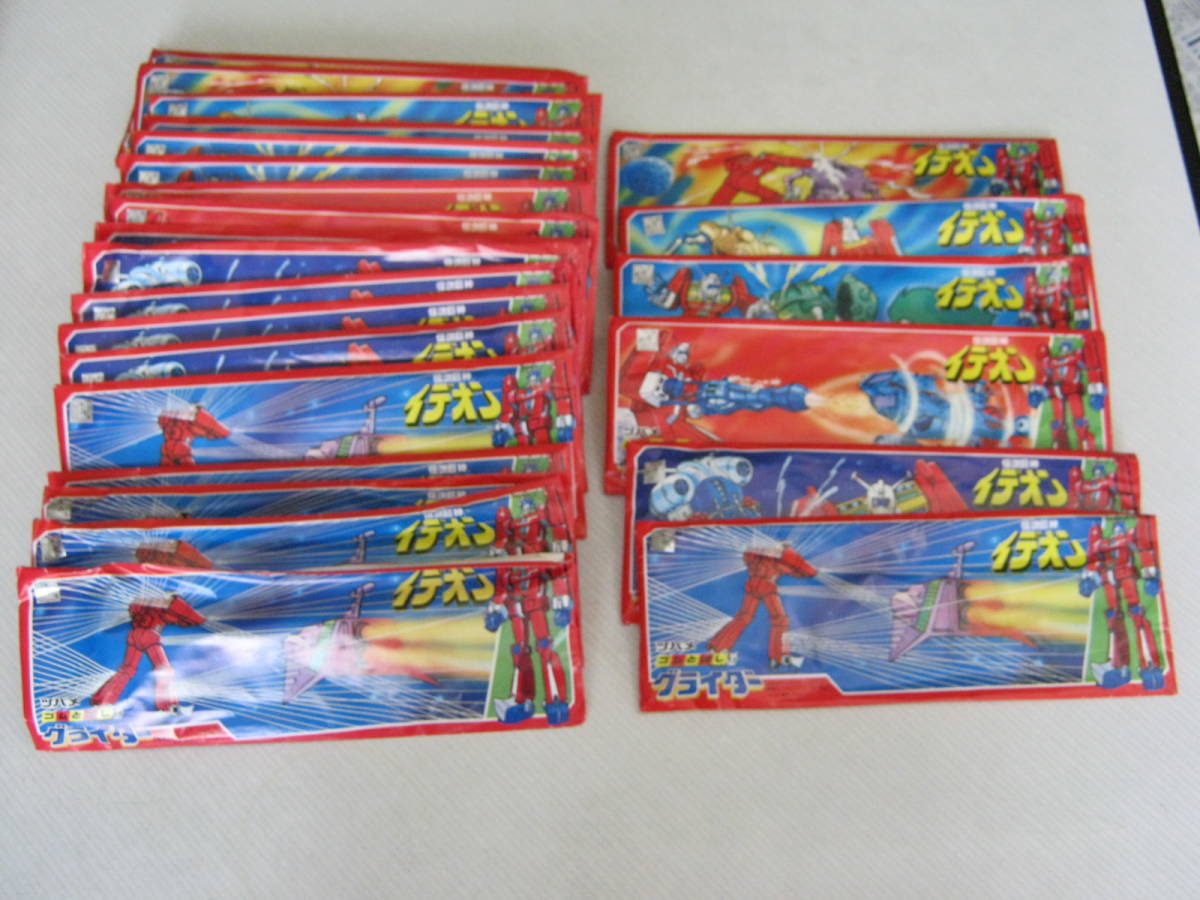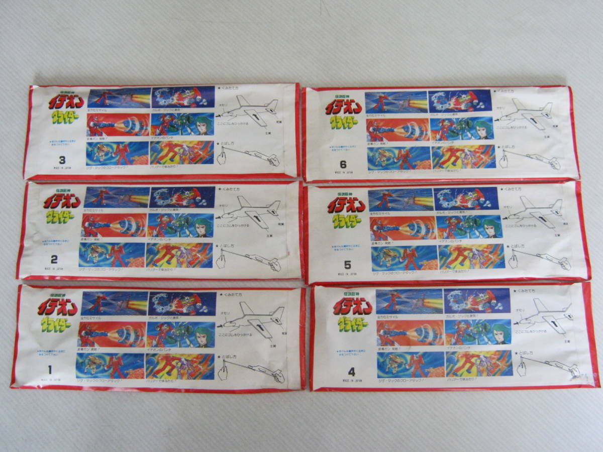 当時物です。箱には30機入りと記載・印字されていますが24機のみです。絵柄が6種入りですが同数ではありません。セット内容の内訳は①全方位ミサイル×6機 ②ガルボ・ジックと衝突!×6機 ③波導ガン発射×3機 ④イデオンのパンチ×3機 ⑤ジグ・マックのクローアタック!×3機 ⑥バリアーで体当たり!×3機 以上624機セットです。各、未開封物です。各、袋のサイズは約24.2㎝~24.7㎝×8.7㎝~9㎝位です。袋にバラつきがあります。各、袋に丸の中にCの文字 日本サンライズ 東急エージェンシー テレビ東京 12chの印字と印字されたシールが貼ってあります。袋にMADE IN JAPANの印字があります。袋に汚れ、折れ、シワがある物があります。袋を開封しておりませんのでわかりませんが付属部品にゴムがある場合 製造からかなり経過しておりますのでゴムの劣化して使用できないと思われます。ご理解ください。箱の状態は汚れ、キズ、折れ、シワ、サケがあります。箱に丸の中にCの文字 日本サンライズ 東急エージェンシー テレビ東京 12ch  MADE IN JAPANの印字があります。箱サイズは約25㎝×21㎝×9.5㎝位です。