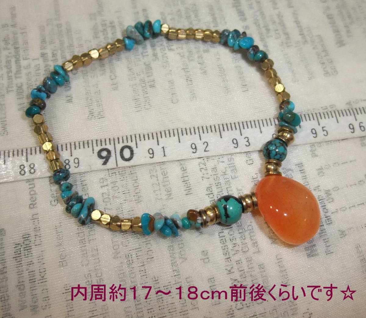 アメリカ産本ターコイズさざれとファイヤーアゲート等ブレス☆本トルコ石本ターコイズ(丸珠はスパイダーウェブのも)ブレスレット♪高品質な真鍮スペーサービーズと本ターコイズ本トルコ石丸珠とファイヤーアゲートのブレスレット☆まずまずのスパイダーウェブの珠も色々入った丸珠のトルコ石と高品質な古い真鍮スペイサービーズをバランス良く贅沢にゴムブレスレットに仕上げてみました♪大体のサイズは2枚目画像に記載してありますが、このシリーズのブレスは、やや細めの方から普通サイズ、やや太めの方まで、付け方によって使用していただけるかと思います♪ ☆