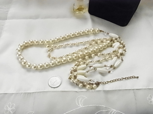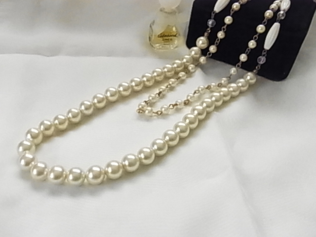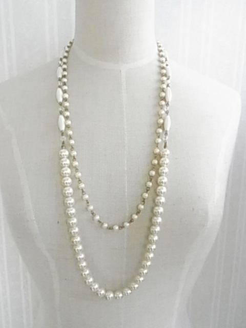 豪華2連 プラスチックパールとパール調ビーズにクリアと楕円ビーズビジューが素敵なデザイン ロングネックレス◇