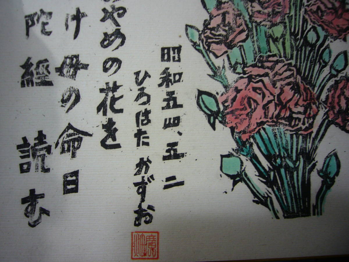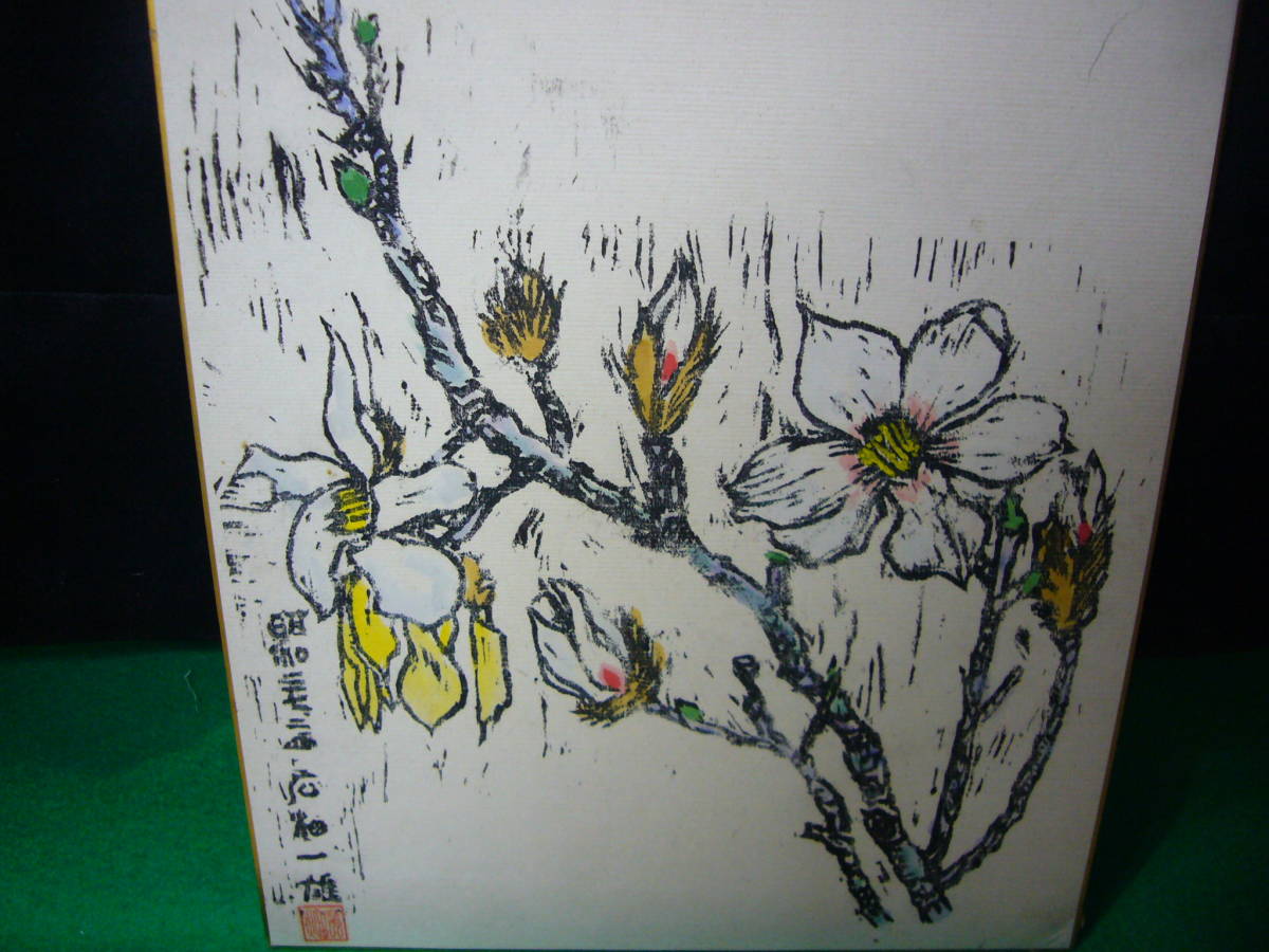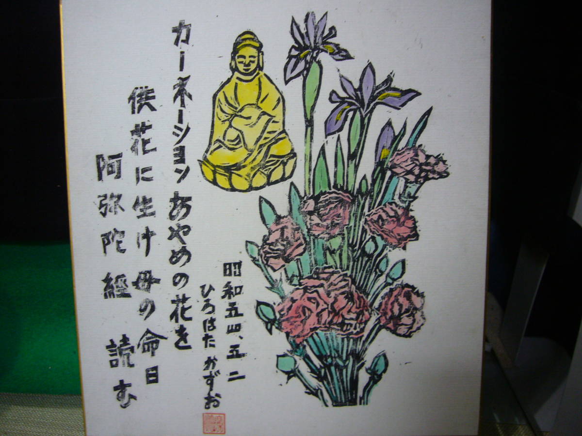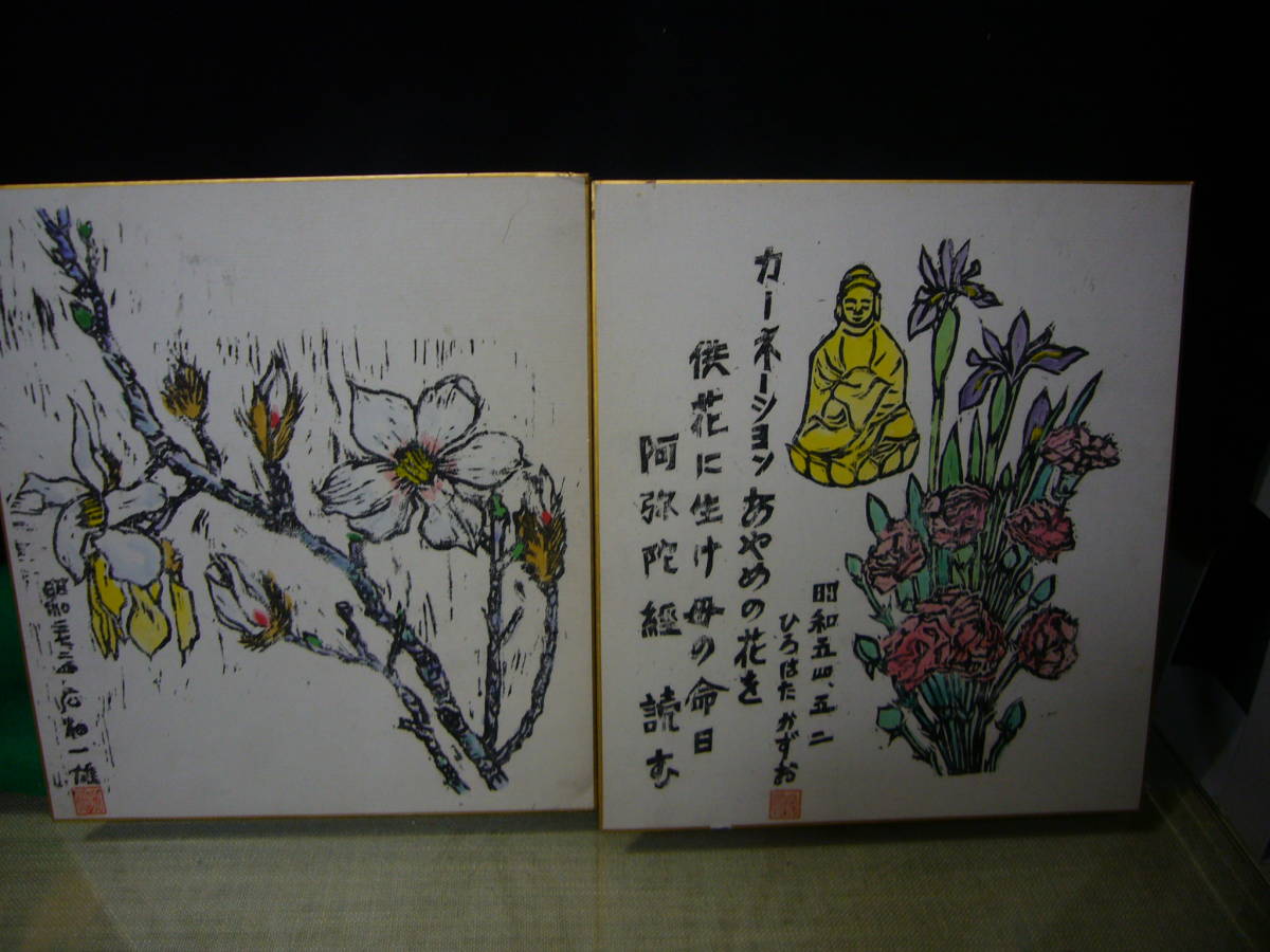 『色紙』(あやめ&カーネーション仏像)・識語 木版画・広畑一雄・落款・昭和54年など・2枚 絵画:木版画『モクレン』金縁傷み少々汚れ有り 篠路:S26567・2018.5.28 | ||||