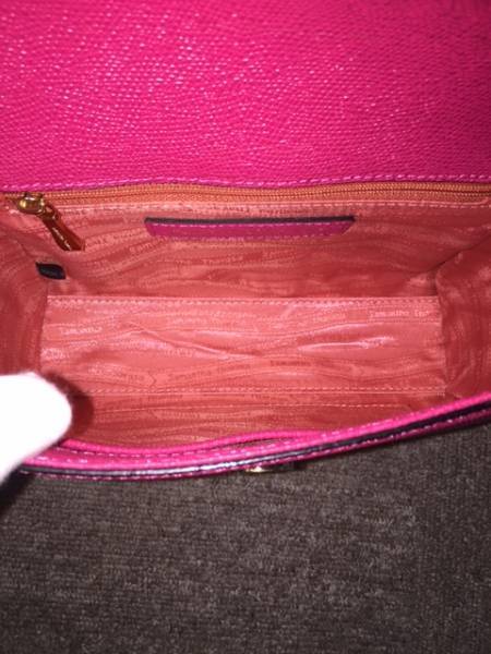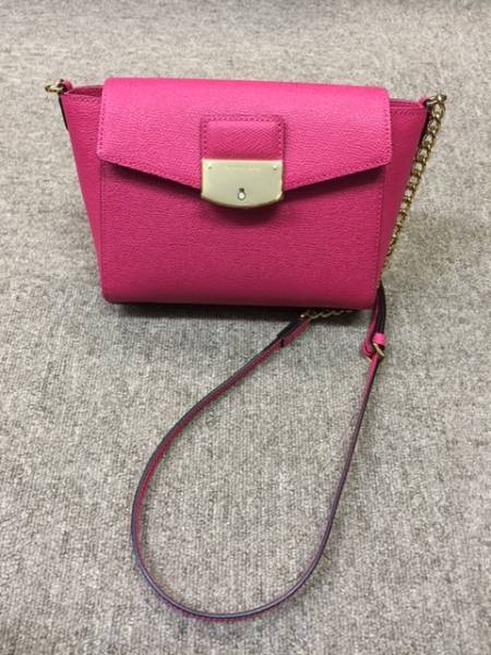 正面にはブランドロゴが入ったゴールド金具が付いていて、マゼンタのレザーでチェーンショルダーなので素敵で高級感もありますね。