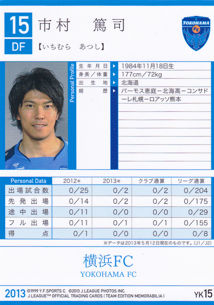 横浜FC2013 YK15 市村篤司 Jリーグオフィシャルトレーディングカード チームエディションメモラビリア 北海高 コンサドーレ札幌