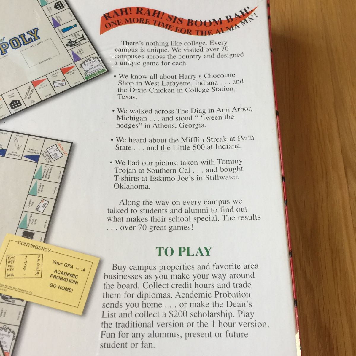 約54種類、ほぼ各州の大学をモチーフに大学の施設名やご当地ネタを数多く盛り込んでそれぞれのモノポリーが制作されています。