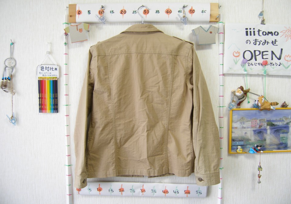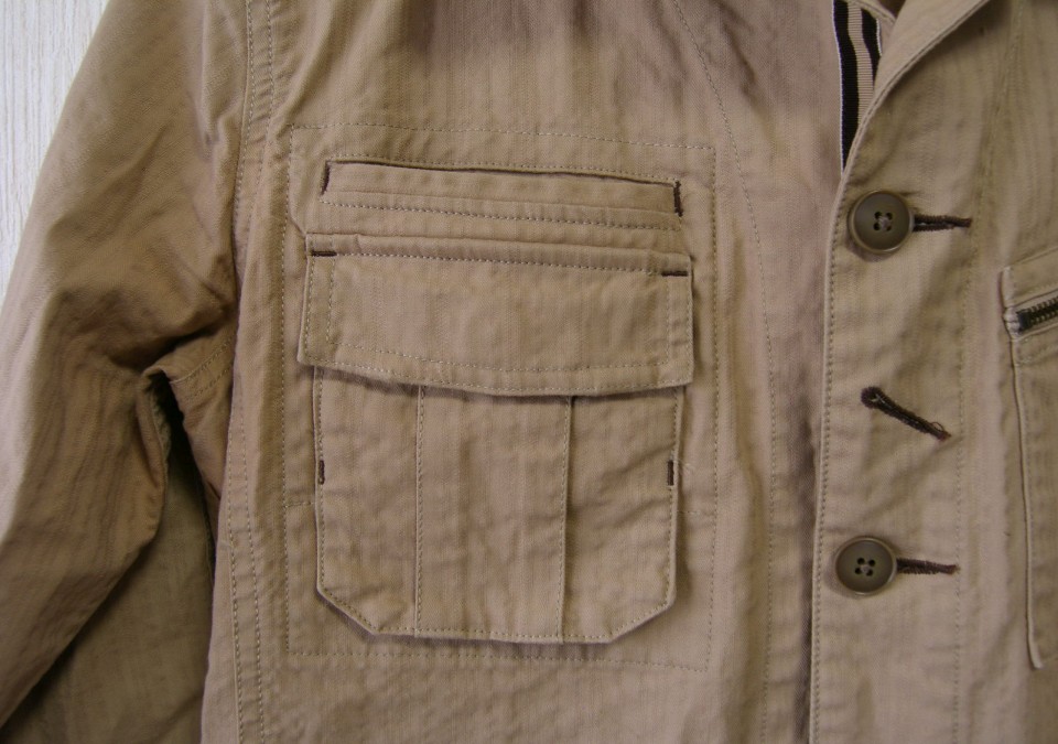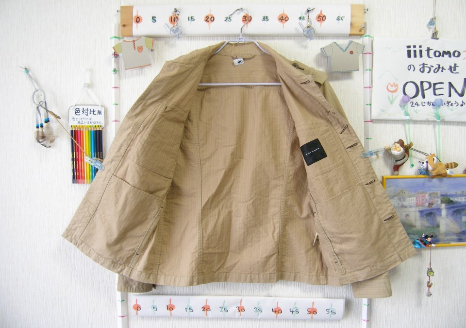 商品の補足説明(主観的な内容も含む) 普通かやや薄い位の丈夫そうな生地で、作りもしっかりしていてデザインもなかなか良いと思います。 目立つような傷・汚れはありませんが、全体に、色あせによる色むらがあります。(もともとはもっと濃い色だったのかもしれません) 襟の折り目は色落ち感があります。 襟の端にやわらかいワイヤーが入っています。 両裾の内側は、内ポケットになっています。 |