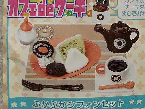 ■メガハウス『カフェdeケーキ/ふかふかシフォンセット』の開封品です。色遣いやデザインがとっても可愛くてお洒落なカフェのケーキセット。スイーツもとってもリアルです。重さは15グラムほど。