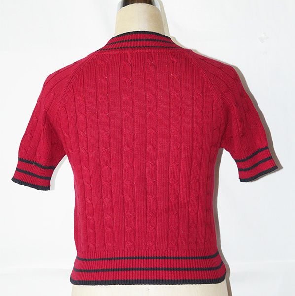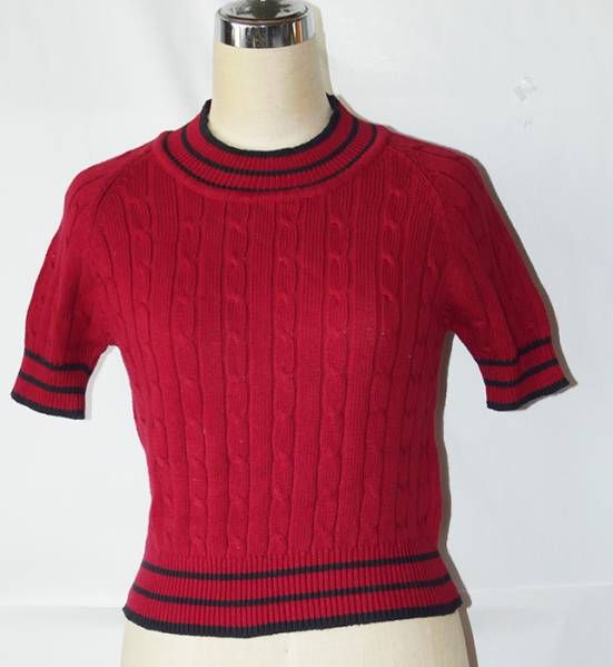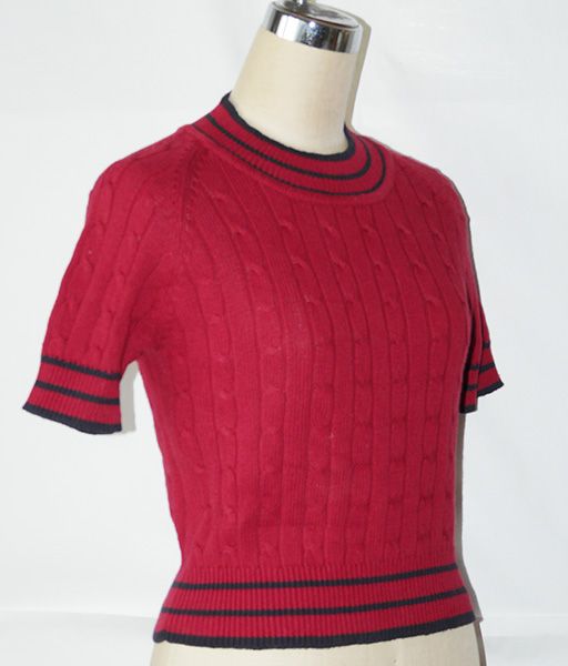 綿100% ケーブルー編み レディース 半袖 Crew NeckニットRed