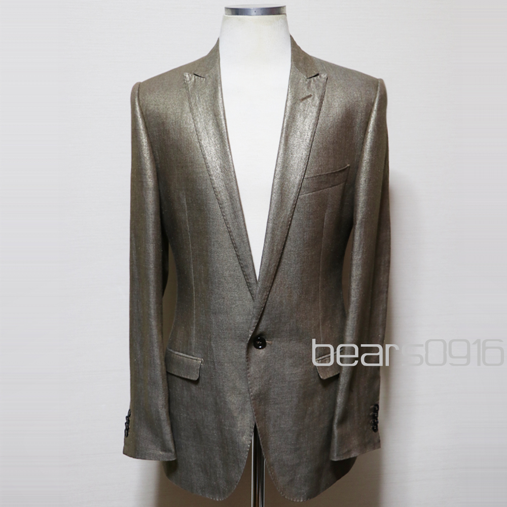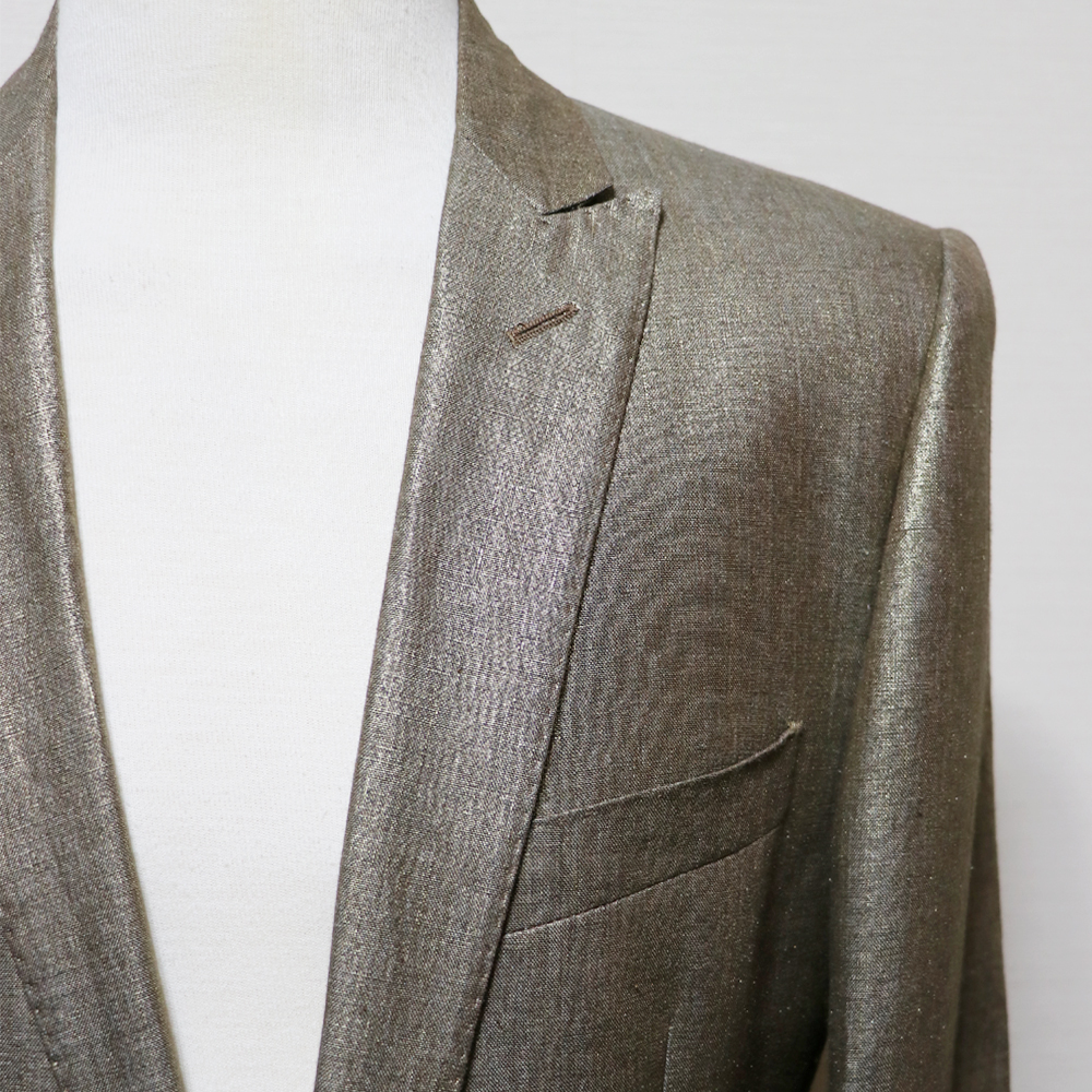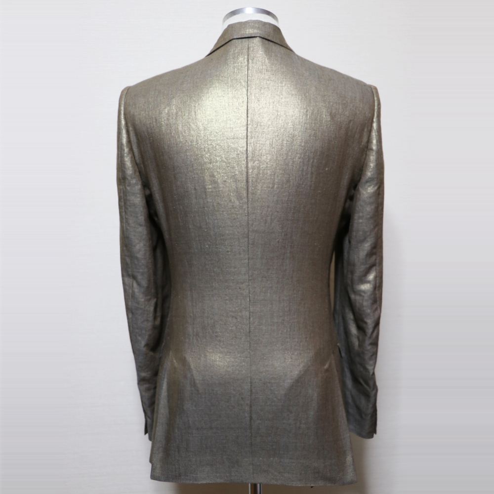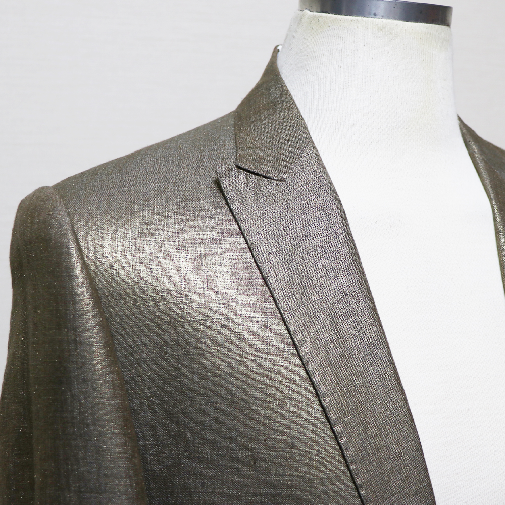 一目で高級とわかる特殊なメタル混リネン素材を使用したGOLDカラーに、タイトでとても美しいシルエットの最高級ドレスジャケットです。