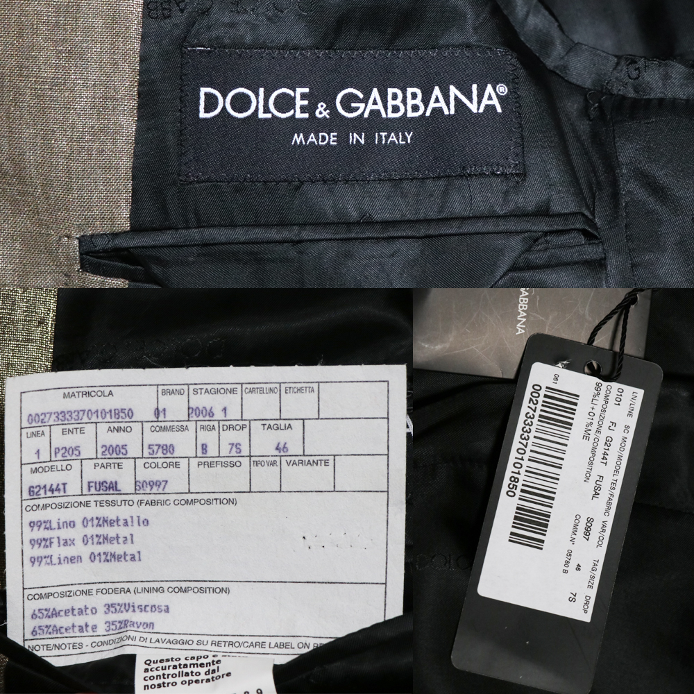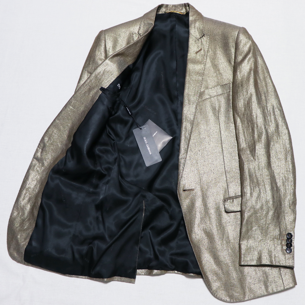 新品ランウェイ登場モデルのDOLCE&GABBANA ナローピークドラペルリネンジャケットGOLD46サイズです。