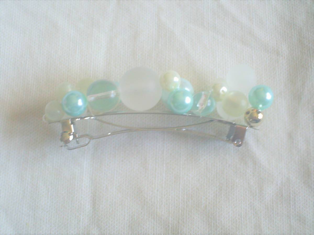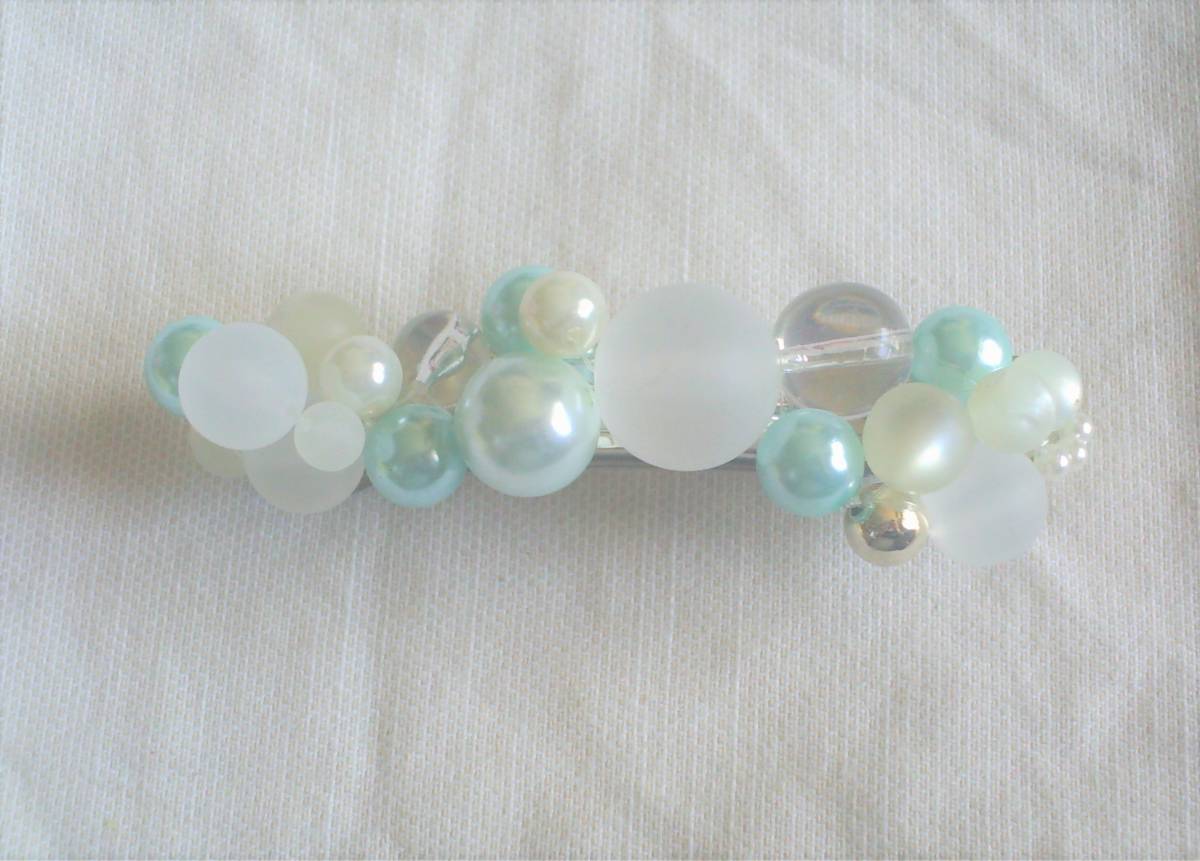 新品・ハンドメイドです。 長さ8cmのバレッタ金具を使って作りました。 素材 アクリル・ガラスパール・メッキ カラー 金具 銀色 その他 少し緑がかったやさしい水色 透明 白 スモークホワイト | |||