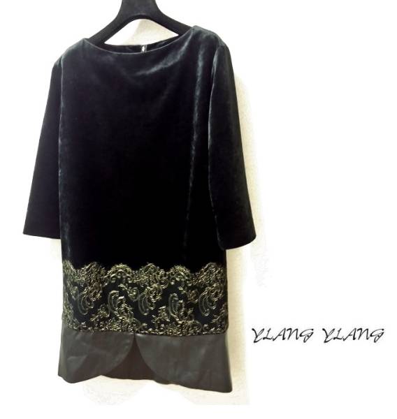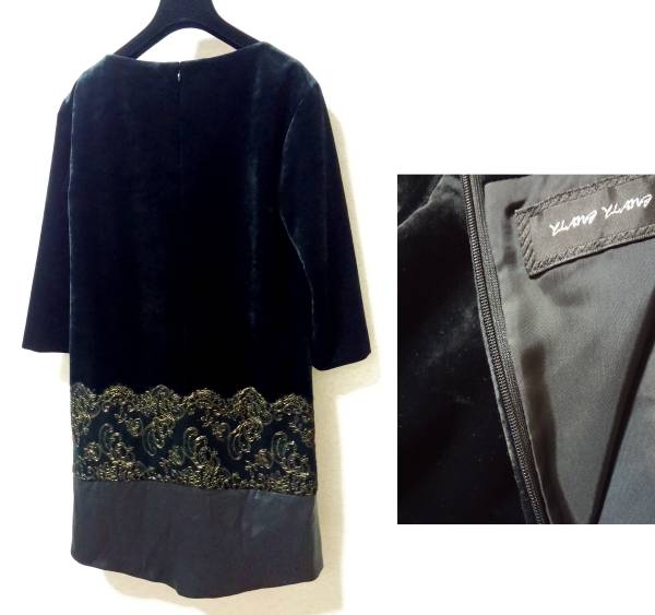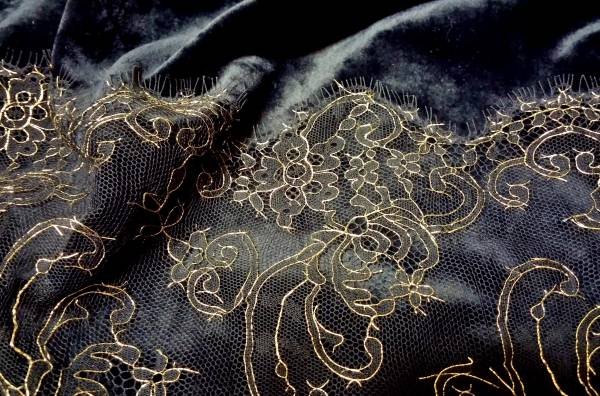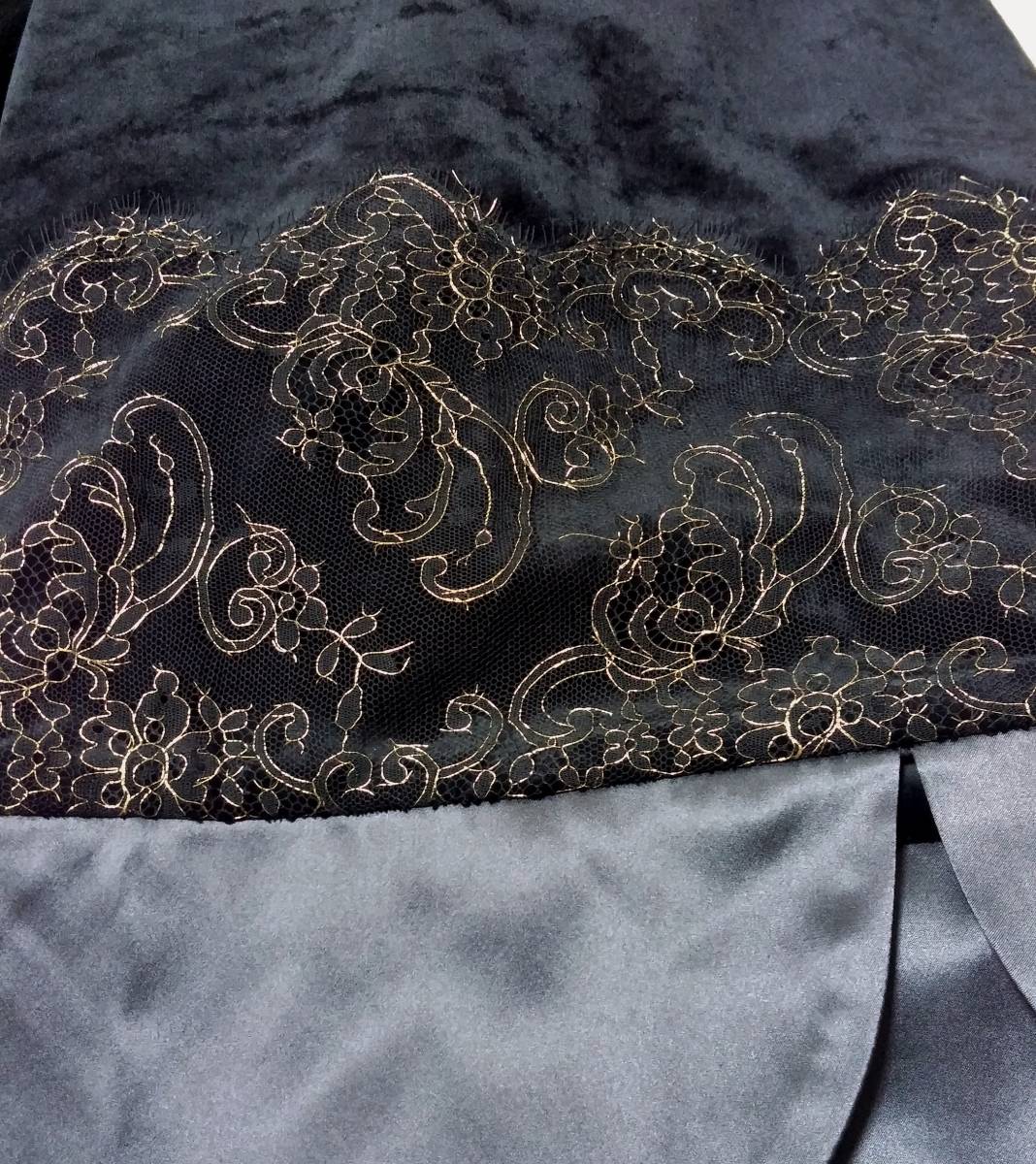 しっとりした柔らかなベルベットに金糸の刺繍レースを重ね、裾をシルクで切り替えた高級感のあるデザインです。