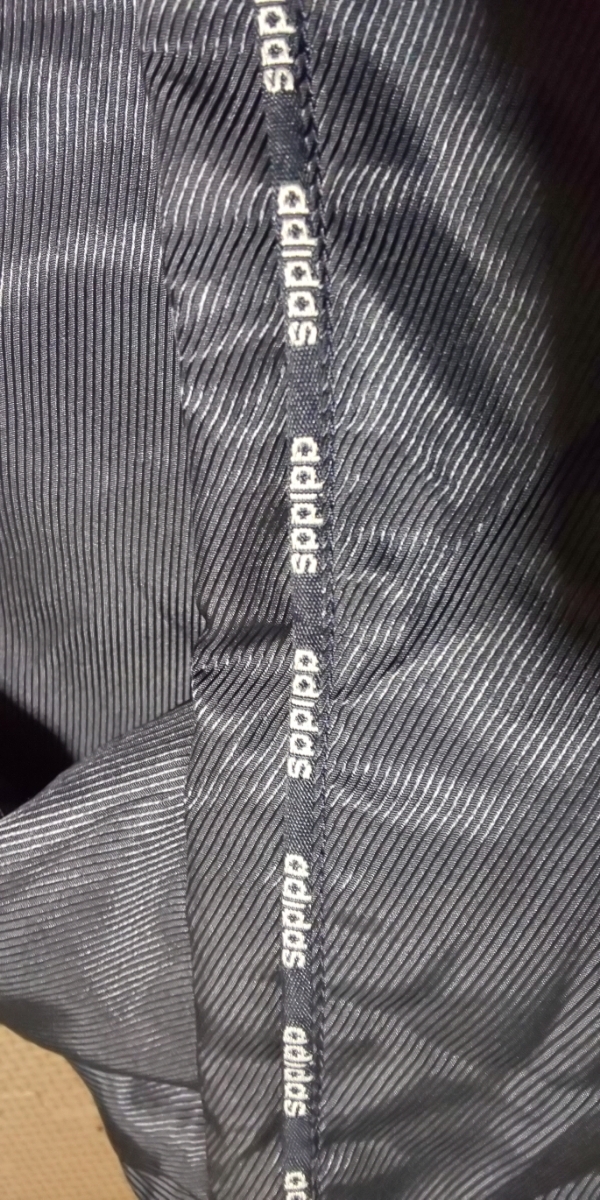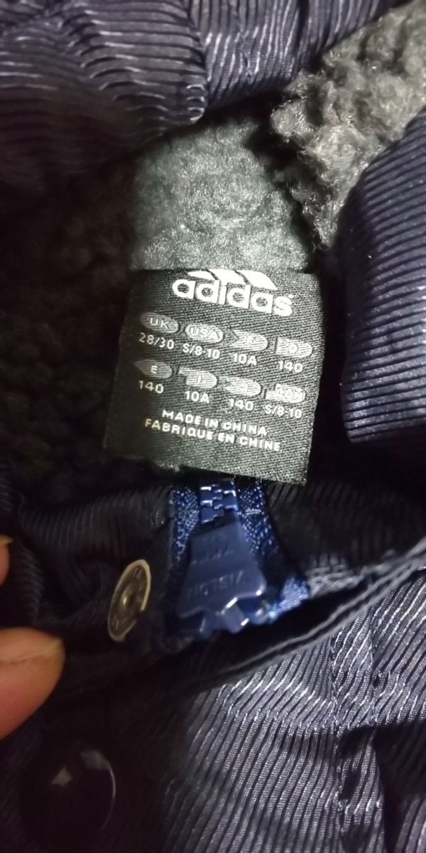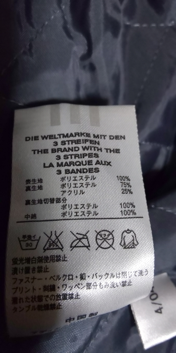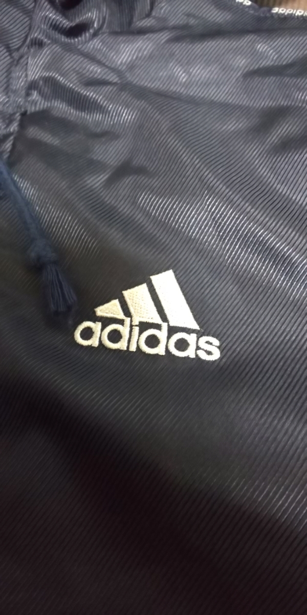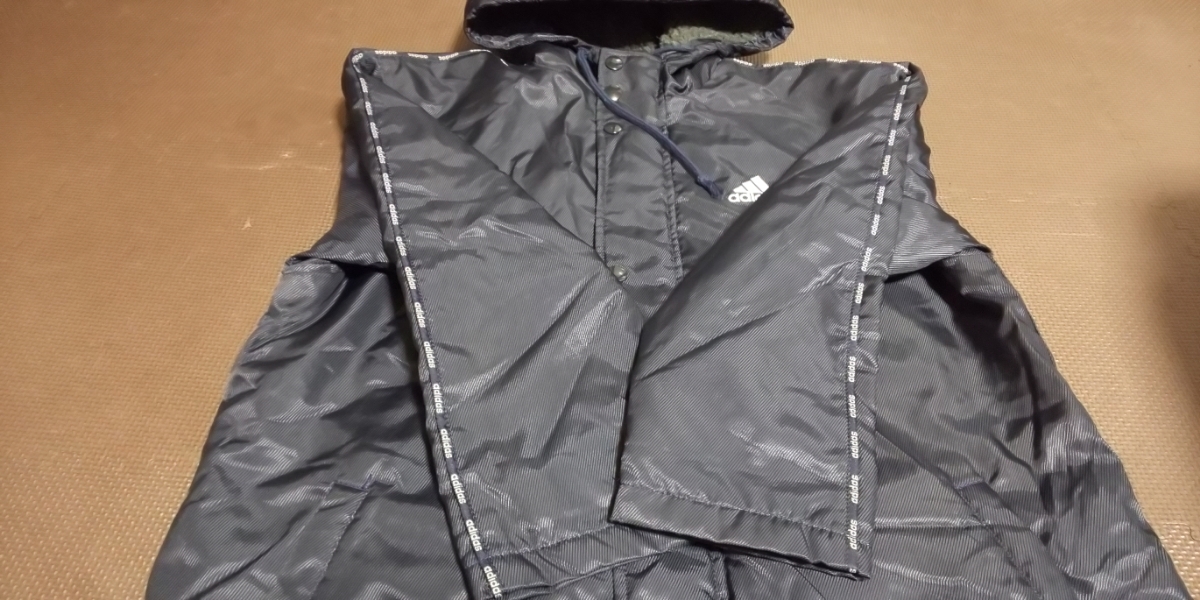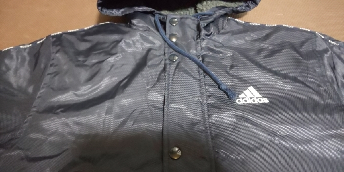 adidas裏ボア濃紺、ラインロゴ入りベンチコート
