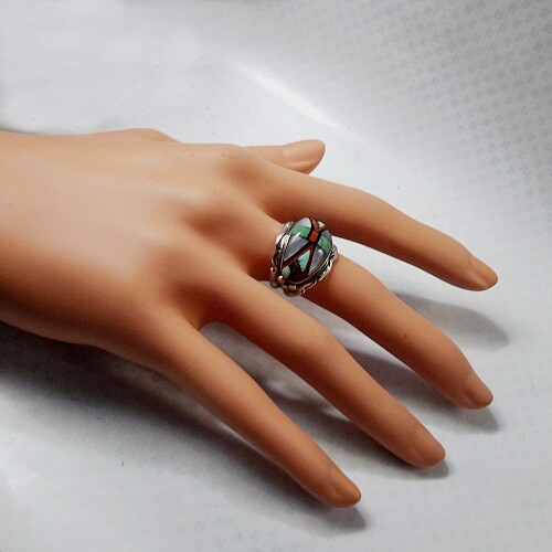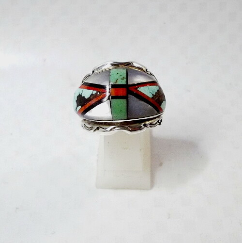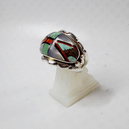 説明 | 人気のターコイズを使ったズニ族インディアンで有名な インレイ技法で作られた シルバー925製の未使用リングです! ターコイズ・珊瑚・オニキス・シェル・珊瑚を使って かなり高度な技術で作られてる1点物です。 ターコイズもブルーとグリーンを使ってあり デザインのこだわりは凄いです。 試着感はかなり目立ちますしお洒落です! |