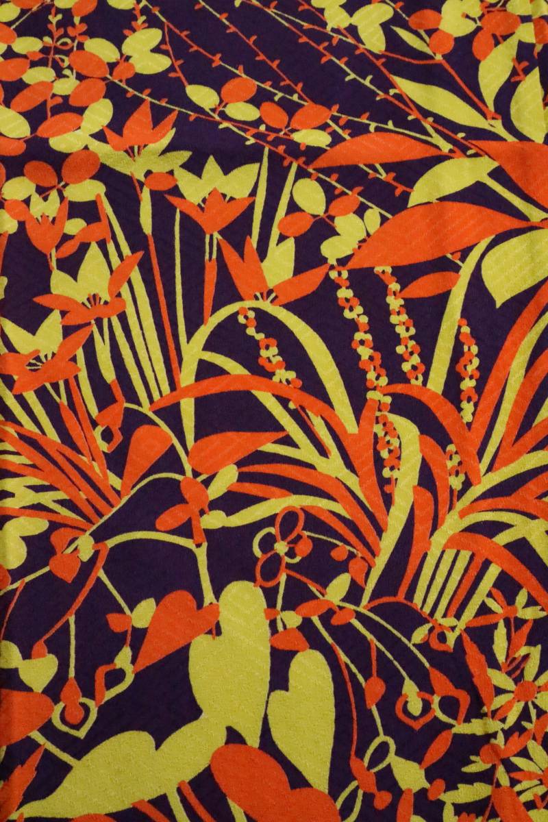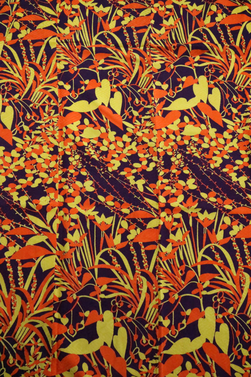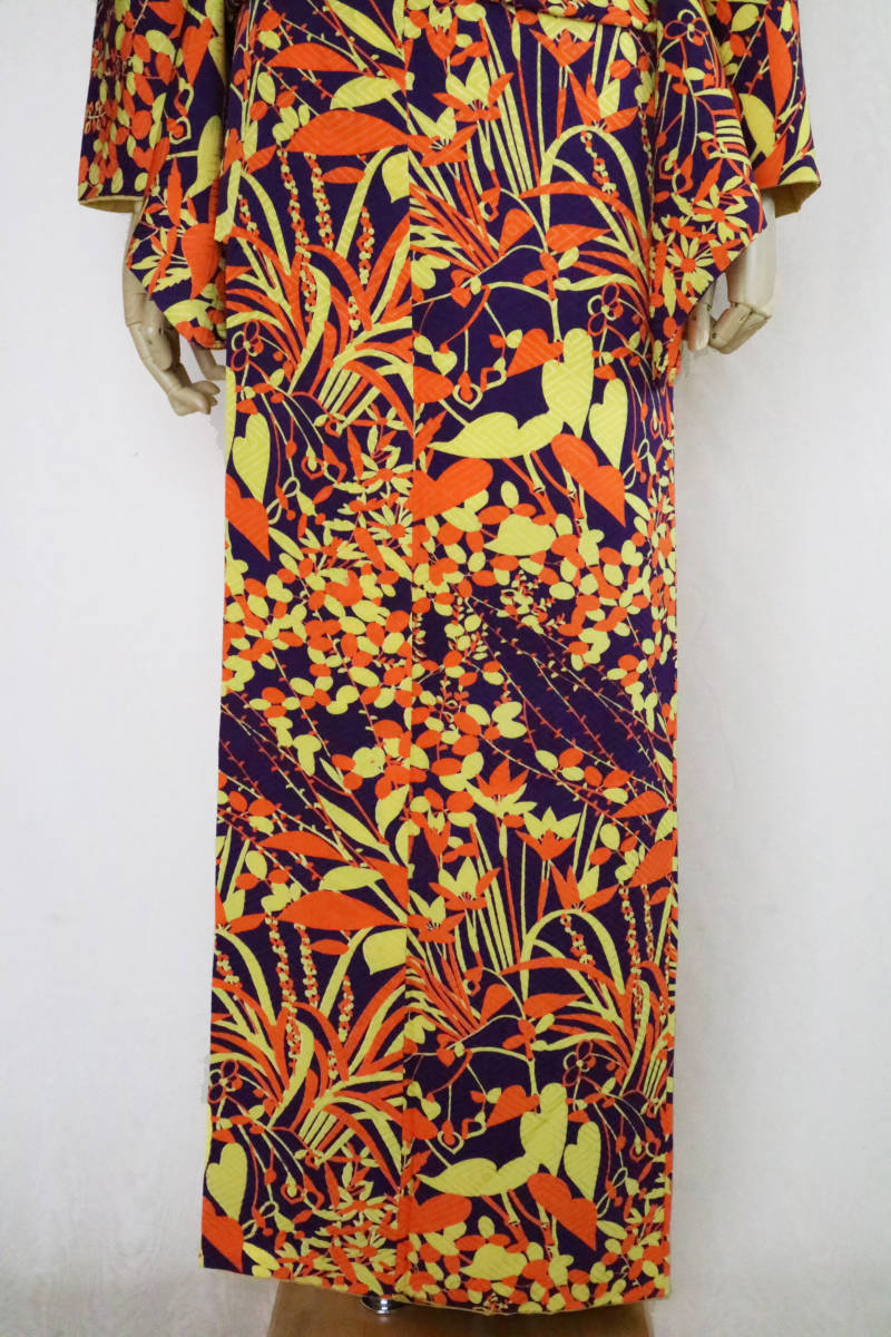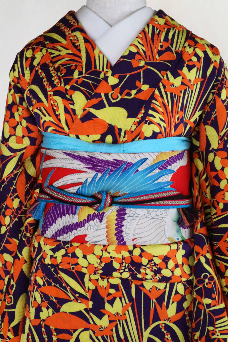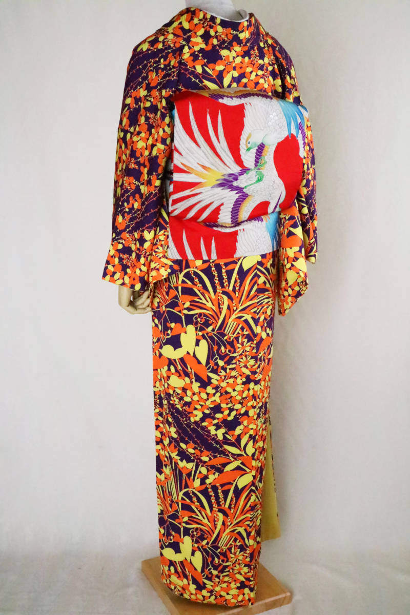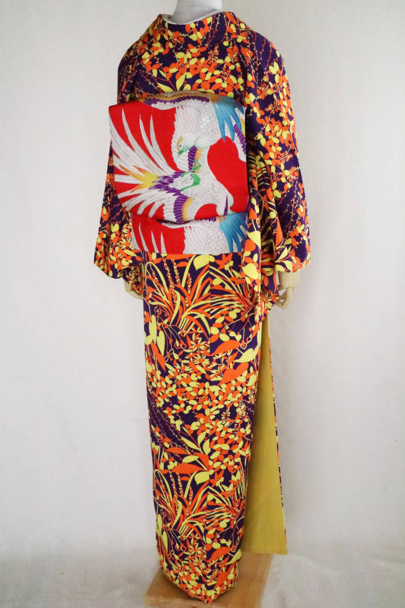 | 至極色地に、鮮やかな黄色やオレンジで、萩などの草花が染められた、小紋です。 | ||