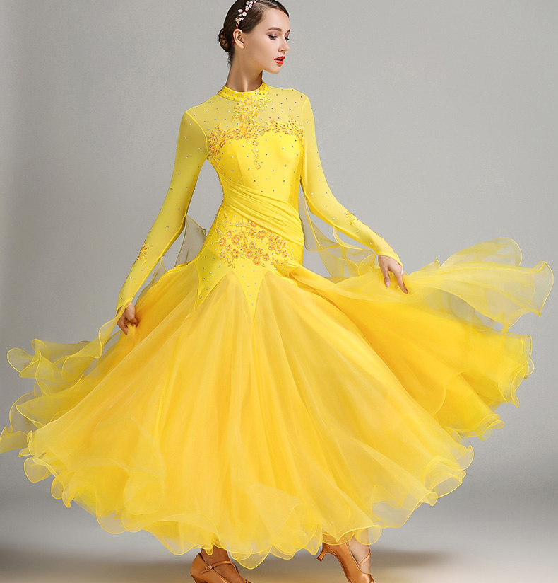 新品 社交ダンス ダンス衣装 モダン競技ロングワンピース 長袖 黄色 サイズS M L XL XXL