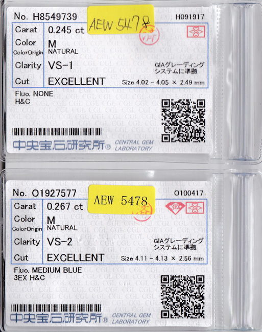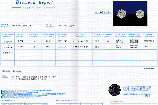 ★ご注意ください | H&C(ハート・アンド・キューピッド)の鑑定結果は、裸石で鑑定を行った場合のみに記載されます。こちらの鑑定書はピアスとして製品となった後に取得しているため、鑑定書にH&Cの記載はございませんが、裸石の状態で取得している「ソーティング」と呼ばれるミニレポートには記載がございます。「ソーティング」は鑑定書の基になるもので、品質を証明するものとしては鑑定書と同等の信頼性を持ちますので、ご安心ください。もちろん「ソーティング」も付属品として、鑑定書とともにお届けいたします。 | |