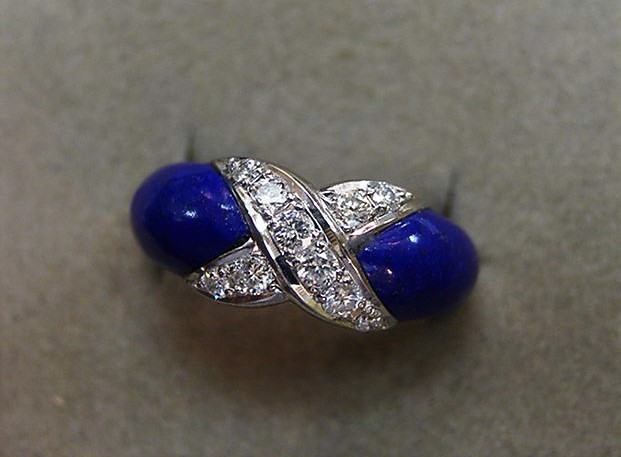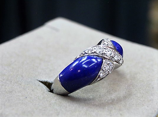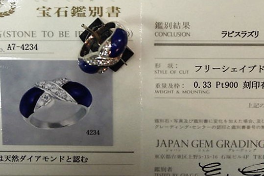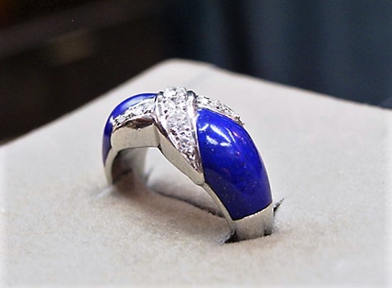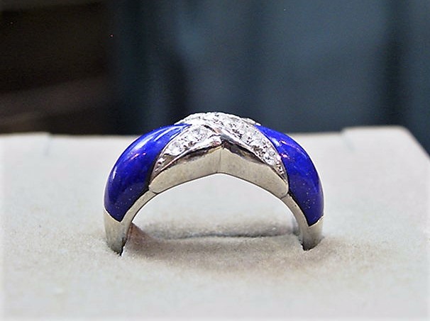 【総重量=8.6g・指サイズ=【13号】(注意:デザイン・造り上、サイズはお直し出来ません。ただ、将来にサイズが変わってしまった場合は、前後2号位は、サイズ直しが出来ますのでご安心下さい。)・天然ダイヤモンド:0.33cと天然ラピスラズリ入り】*本物・鑑別書付き。