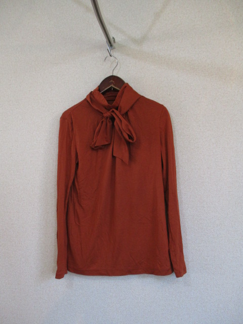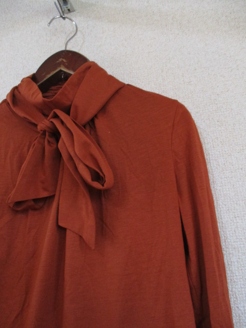 | 商品紹介 | ハイネックの長袖カットソーです。 胸元と襟にギャザーが入っています。 キャロットオレンジのような茶とオレンジの中間のような色合いです。 付属で襟もとで結ぶ、同素材の棒タイが付いています。 《素材》 レーヨン72% 指定外繊維(AHF)28% |