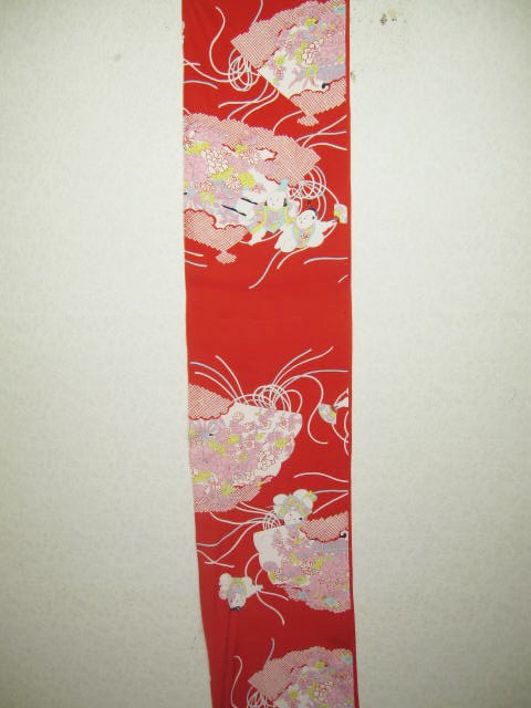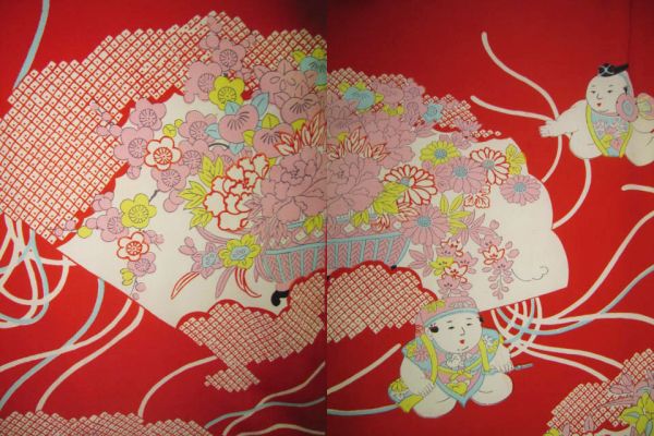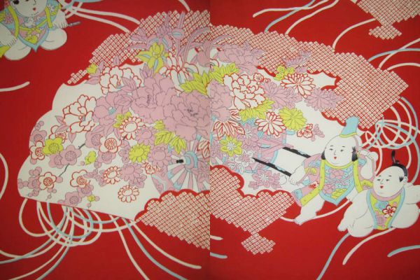 古布綾1★赤地*唐子*扇*花車*牡丹*菊*人絹*古布はぎれ★アンティーク=212㎝