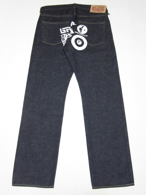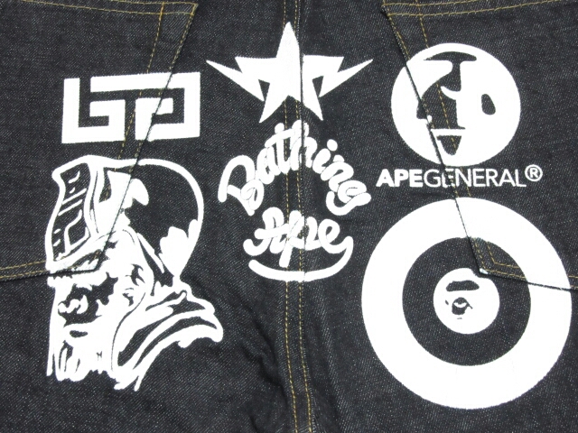 ワンウォッシュ程度のウォッシュ加工・スクープポケットのスレーキ部は1stカモフラ(BLUE)・ヒップ部分は人気のSTA・GENERAL・TARGET等のデザインプリント・セルビッチ部には「*A BATHING APE "APE SHALL NEVER KILL APE"」メッセージ