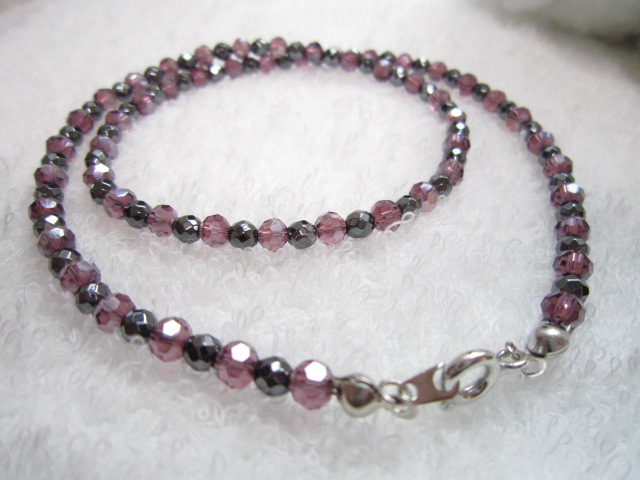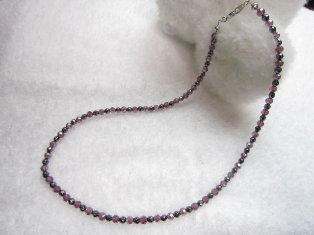 ★★★画像はヘマタイト石の4㎜カットタイプとガラスビーズ玉の4㎜カットタイプを組み合わせてデザインしたお洒落なネックレスです。★★★ ★★★ネックレスの長さはフック部分を合わせて約42㎝です。首もとをシンプルに飾るお洒落で高級感溢れる商品に仕上がっております。★★★ ★★★すごくお洒落で綺麗な商品です。★★★ 【ヘマタイトとは】 ヘマタイトは和名で赤鉄鉱と呼ばれている通り、鉄鉱石のひとつです。密度が高く硬く結晶した酸化鉄で、鉄の含有量が約70パーセントを超えるもっとも重要な鉄鉱資源となっています。 ヘマタイトのなかでも光を反射するほど綺麗に結晶するものがあります。「鏡鉄鉱」といい、宝石として、大きく結晶したものなら彫刻の素材としても利用されます。 【ヘマタイトの意味】 ヘマタイトの語源は、ギリシャ語で「赤い血、血に似ている」を意味する「haimatitis」からきています。前述した通りヘマタイトは酸化鉄ですから粉は赤く、顔料としても利用されました。そのことから、血と生命力を象徴する石として考えられたようです。 また、人類の歴史に鉄器が現れると、戦争でも青銅に代わり鉄製の武器が作られました。血と武器と戦場という繋がりから、ヘマタイトが「戦いと勝利」という意味を持ったのも頷けます。 ヘマタイトは生命力と勝利を象徴し、戦いの守護石として古い歴史を持ったパワーストーンなのです。 【ヘマタイトの効果】 ヘマタイトは血液に力を与えることで、身体能力を高めてくれます。ヘマタイトは身に着ける人の血液に力を与えるエネルギーを持ちます。赤血球の働きを活性化し、全身への酸素供給量が高まることから、運動能力を高める効果や肉体労働をされている方には持久力を高める効果を持ちます。脳も活性されます。 ヘマタイトは直接血液に働きかけるストーンで、血液がドロドロで改善したい人、健康になりたい人におすすめです。血液がサラサラになるということは、健康であるための条件の一つでもありますから、体調もよくなります。持っておいて損はないパワーストーンです。 血液の流れがよくなると運動能力が高くなるのでスポーツマンや、日ごろ肉体労働をしている人には非常におすすめのアイテムです。また、体力を増加させる効果があるので、体力の無い人、病気がちの人にもおすすめです。体を動かさない人はヘマタイトを身に着けてウォーキングなどに行くとよいでしょう。ヘマタイトが体を動かし、筋力をつけるキッカケとなってくれるはずです。 【ヘマタイトのヒーリング効果】 〇意思を強くする (最後までやり遂げる意志の強さを得る) 〇生きることへの欲求を強める (生きる力を強める) 〇勝負のお守り (勝負運を高める) 〇健康増進 〇運動能力強化・向上 〇仕事運を高める 〇恋愛成就 〇過酷な運命を跳ね返す強さ (忍耐と根性、困難に立ち向かう勇気) 〇勝利へと導く (勝利と栄光を掴み取る) 〇血液に力を与える 〇判断力・決断力を高める 〇自立心・独立心の向上 〇魔除け厄除けのお守り 【ヘマタイトの体の症状への効果】 出血、炎症、生理不順、生理痛、貧血、冷え性、血液、鉄分の吸収、赤血球、腎臓、足のけいれん、眼の充血、循環器、解毒、肩こり、低血圧、めまい、手足のむくみ、電磁波の障害を吸収 ☆☆☆☆☆ヘマタイトの大きなエネルギー的特性として、持つ人の意思の力を強め、勝負強さを発揮する助けとなることがあげられます。 ヘマタイトをブレスレットやネックレス等として身に着けることで、脳の酸素活用をしやすくし、頭が冴えたり眠気を防いだりする効果もあるようです。 自分の意思を高める効果もありますから、これから本番を迎えるというときにも強い威力を発揮してくれます。緊張して本番では良い結果が出せなかった人、どうしてもこの試合や商談だけは外せないという人は、ぜひヘマタイトを身に着けてその効果を実感してください。 良い方向へ導いてくれるパワーストーンですから、勝負事が常にある人にもおすすめです。精神的にも強くしてくれるので、自分の判断力を高めてくれます。 過酷な運命やトレーニングに負けない精神的強さを養う石であり、経営者やスポーツ選手などにおすすめの石です。 ヘマタイトは心身ともに健康へと導いてくれる石ですので、もちろん一般の方にもおすすめの石です。☆☆☆☆☆ 【ヘマタイトのお手入れ (浄化方法)】 ヘマタイトの浄化法でもっとも気をつけるべきは水と塩です。 ヘマタイトの主成分は鉄ですから、塩分と水分はサビのもと。磨き上げた表面があれてしまいます。もし塩や水がついてしまったら、丁寧に拭き取っておきましょう。 同様にブレスレットやネックレスのようなヘマタイトのアクセサリーを身に着けた場合に、汗や脂がついたら必ずきれいで柔らかな布で拭いてください。 また、太陽光の場合は長時間出しておくとヘマタイトが非常に熱くなる可能性があります。熱を持つと表面の