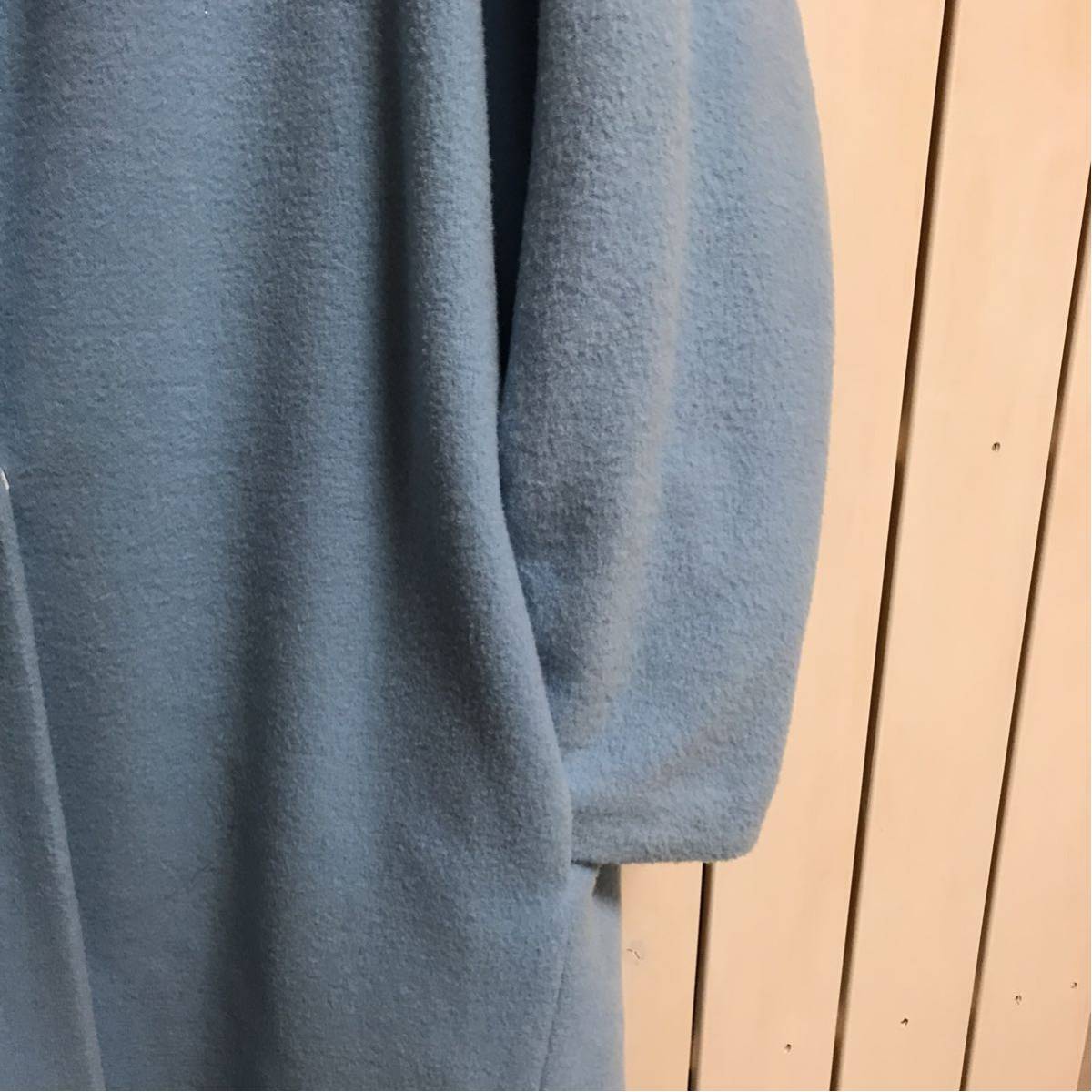 春色のパステルカラー(水色)で、これからの季節は、まだまだ寒いですが、春色(パステルカラー)が着たくなる季節に丁度いい感じのオーバ―サイズでドロップショルダーのチェスターコートです。