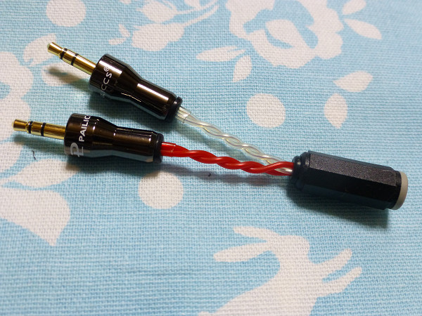 AK式ピンアサイン(R-R+L+L-)の2.5mm4極プラグを「3.5mm×2形式」へ変換します。
