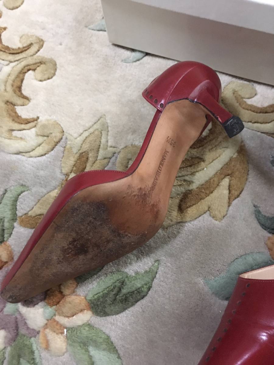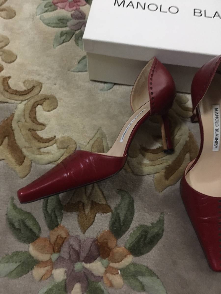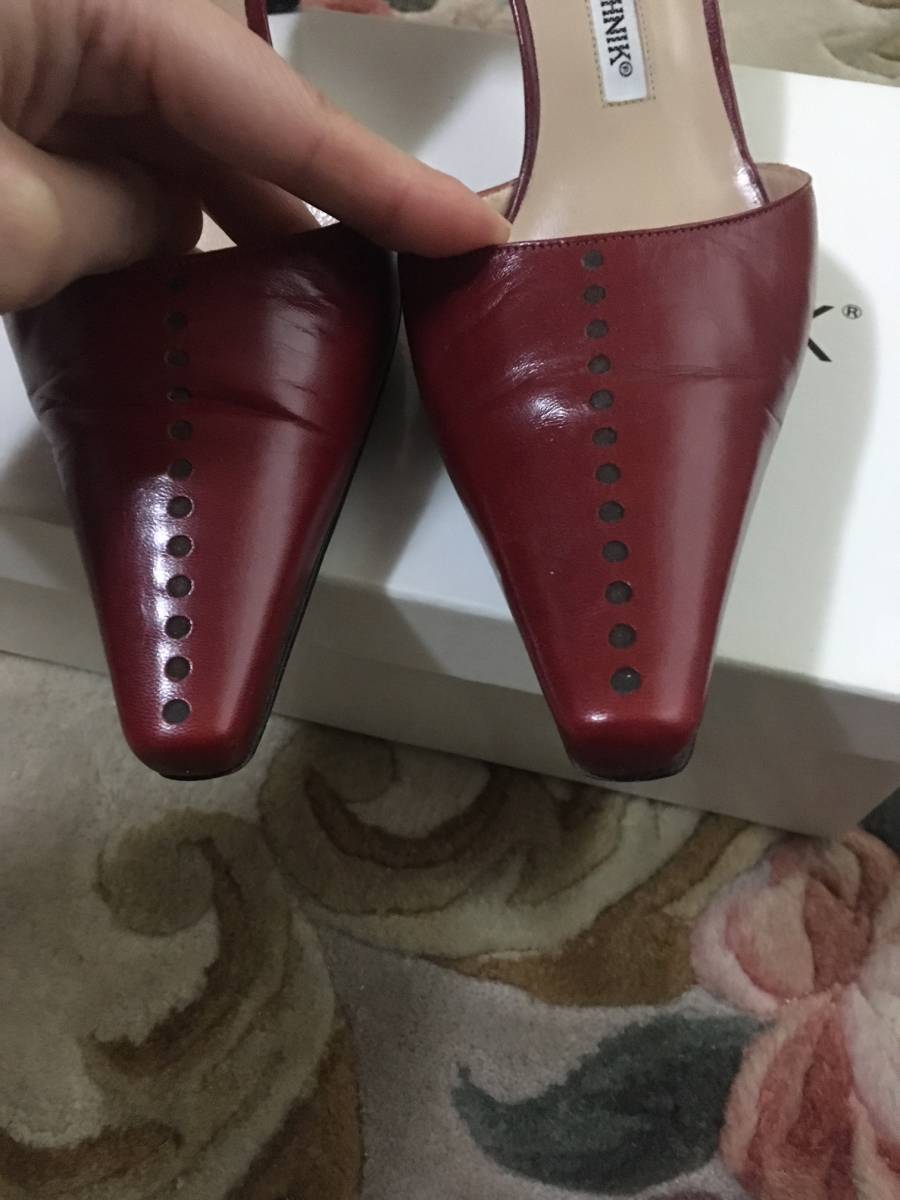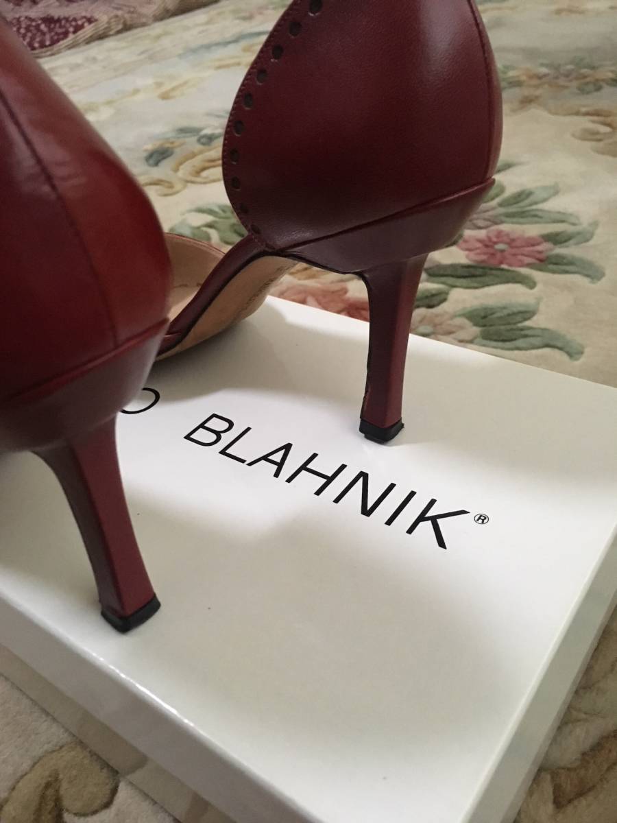 マノロブラニク、ヒール、サイズ35.5、お色はワインレッド、です。ヒールの美しさは、マノロが一番だと思っております。女性の足を美しく見せると共に、履き手の心をウキウキさせる、、、。ジミーチュウやルプタンも素敵ですが、私の足には合わず、ここぞという時は、マノロです。斬新なデザインも多いのですが、ベーシックなデザインの時にこそ、そのフェミニズムがよく反映され、他とものと一線を画しています。ワインレッドのヒールを探しており、こちらにてお譲りいただいたのですが、サイズが合わず、どなたかお好きな方にお譲りしたく思っております。数回着用と伺っており、目立つダメージや臭い等ございません。(目を凝らしていただくと、片方のつま先に若干すれが発見できます)。箱は附属しておりませんで、本品のみになります、どうぞ宜しくお願い致します。