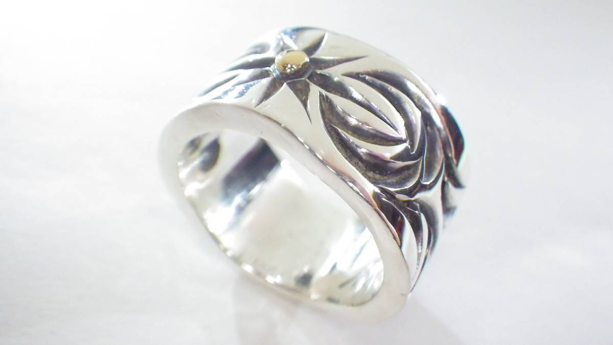 このビッグハンド サンスクロールリングは、平板からバーナーで加熱し、十数回の叩きと曲げ工程を経てリング形状になったものに、更に手作業で切削加工を施し、やすりでレリーフを削り、たがね彫りによって仕上げるという初期ビッグハンドのみで味わうことが出来る、ただの一工程も機械加工を入れていない、純粋に昔ながらの製法で製造された、希少な一本です。
