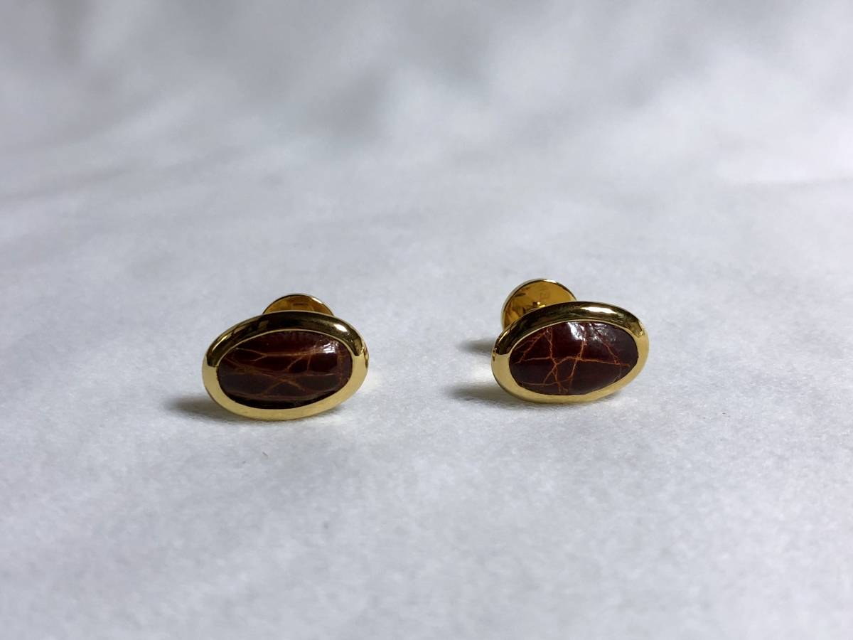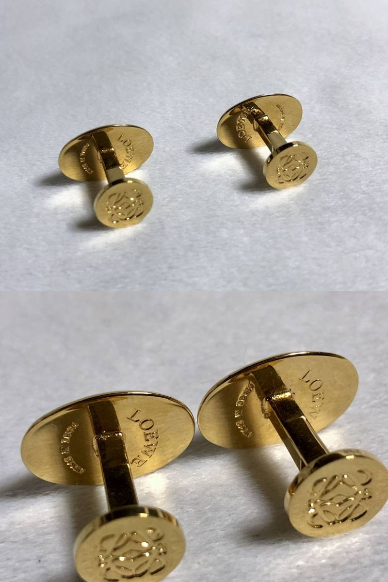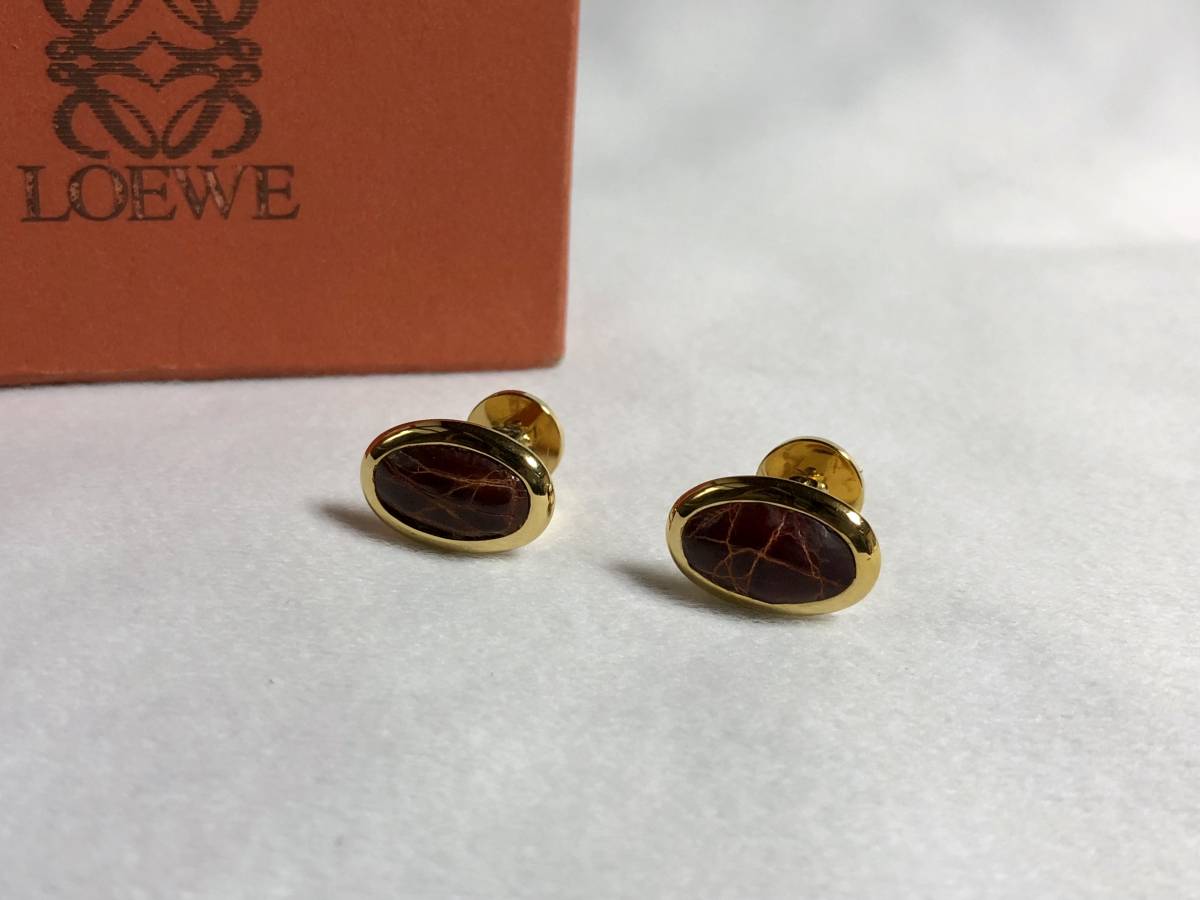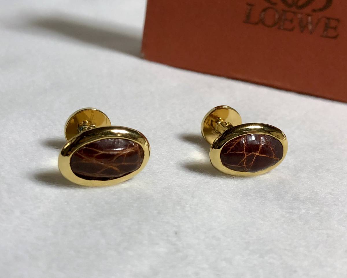 正規良品 激レア ロエベLOEWE アマソナ アナグラム レザー装飾オーバルカフス茶 ゴールド×ブラウン カフリンクス ヴィンテージ立体ボタン