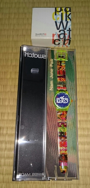 ジュエリーの様な明るい黄緑色のプラスチック製のケースに、雑誌模様の光沢のある柔いストラップ、濃いブルーの上にホワイトで落書きを楽しんでいるかのような文字盤、Zapping はまるで情報化時代幕開けの90年代の時代思潮を映し出しているかのようなウィットに富んだ作品です。