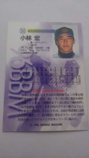 オリックスブルーウェーブ小林宏!1996BBM163元東北楽天ゴールデンイーグルス |