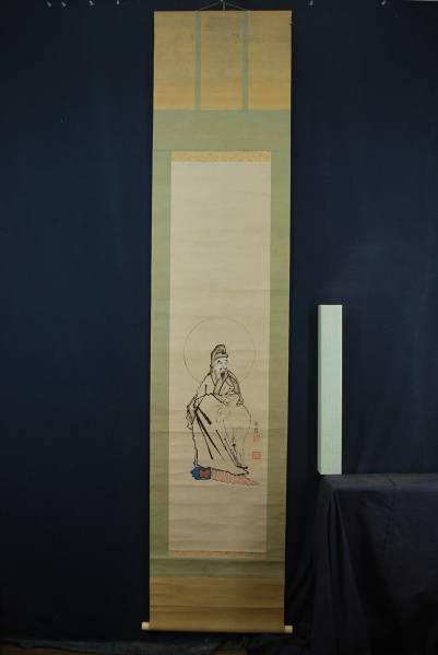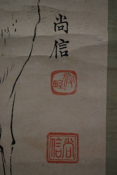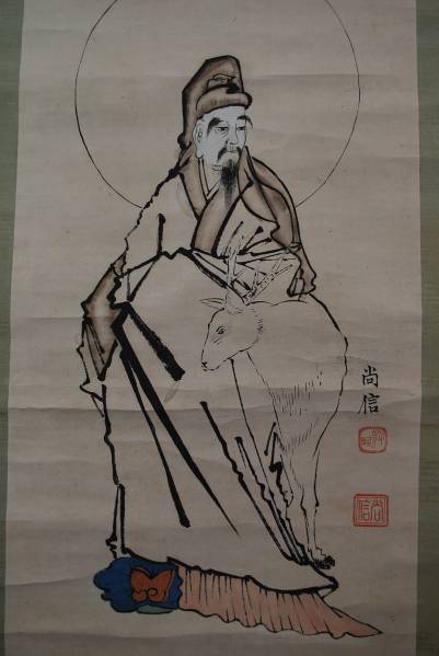 【複製】/狩野尚信/寿老人図/印刷/工芸/【参考】狩野尚信(かのう なおのぶ、慶長12年10月6日(1607年11月25日) - 慶安3年4月7日(1650年5月7日))は江戸時代初期の狩野派の絵師。狩野孝信の次男で、狩野探幽の弟、狩野安信の兄。子に狩野常信がいる。通称は主馬、自適斎と号した。【作品状態】 本紙は紙で印刷、工芸品です。 本紙は薄汚れ、全体に多数のよく目立つい汚れシミ、多数の折れ、巻シワあります。状態は悪いです。 表装は多少の時代感あり、薄汚れ、天地に多数のよく目立つ汚れシミ、数ヶ所の虫穴あります。状態は非常に悪いです。 紙箱付 軸丈 縦 208㎝×幅 51㎝ 写真で状態をご判断の上、宜しくお願い致します。