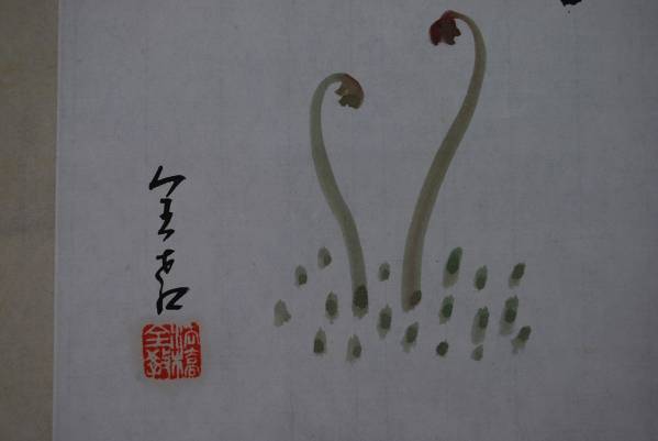 【参考】【複製】/法橋全教/和/わらび図/工芸【作品状態】 本紙は紙で工芸品です。 表装は紙表装で多数の糊シミあります。   紙箱付    軸丈 縦 143㎝×幅 41㎝   写真で状態をご判断の上、宜しくお願い致します。