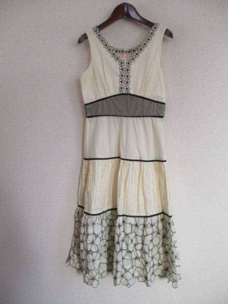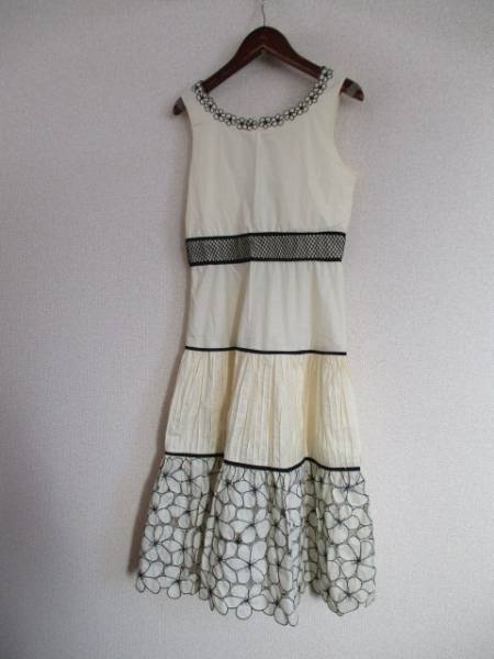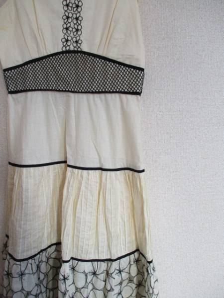 商品紹介 | 薄い黄色に黒がアクセントで使われたノースリーブワンピースです。 ハイウエスト位置に黒い編み柄の切替えが付いていてスタイルよく見える形です。 襟周りと胸中央に花の刺繍が入っていて、花の形を黒い刺繍で形どった 凝ったデザインになっています。 (裾は花の形どうしの間が少し開いています。) スカート部分は一番上が本体生地、中央がピンタックが全体に入った生地、 裾が花モチーフ生地です。 スカート部分のみペチコートが付いています。 《素材》 品質タグを切ってしまっていて、不明 |