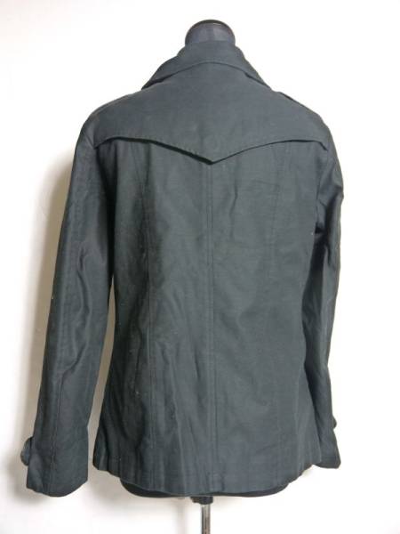 サイズ表記38で、実測で、肩幅43cm、身幅53cm、着丈(背中側の中央の衿元~裾)65cm、袖丈(肩~袖口)60cmです。