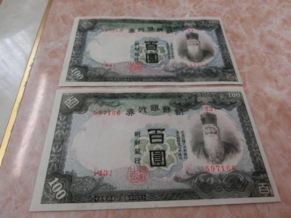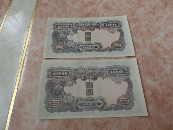 朝鮮銀行券 朝甲100円券の極美品を連番で2枚セットです。