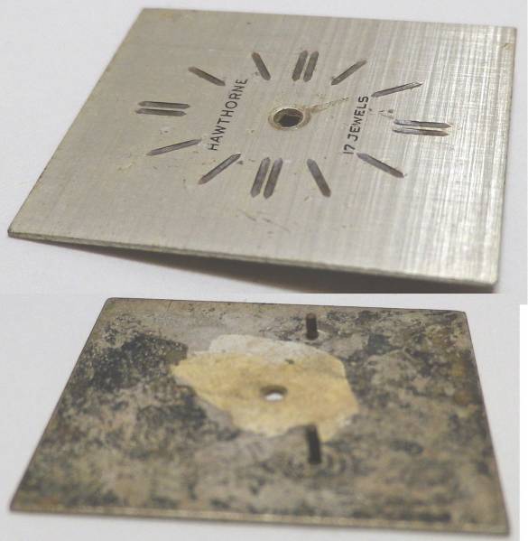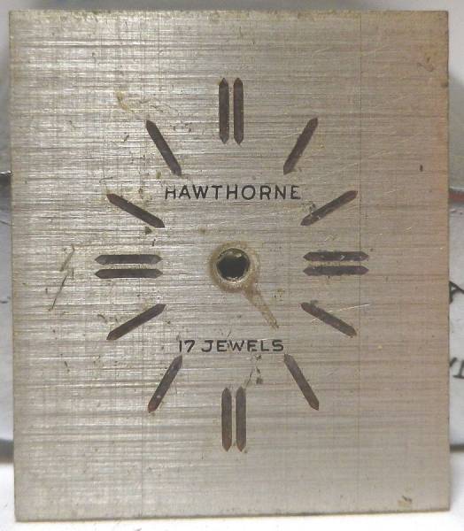 SWISSの時計メーカー『HAWTHORNE』の文字盤です。銀文字盤です。3針用文字盤です。文字盤は汚れなどあります。文字盤の取り付け足は2本です。ムーブメントに取り付け可能です。時計パーツやディスプレイとしても良いと思います。一味違う物をお求めの方にお勧め!