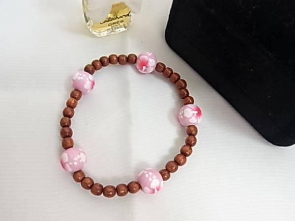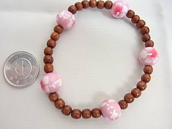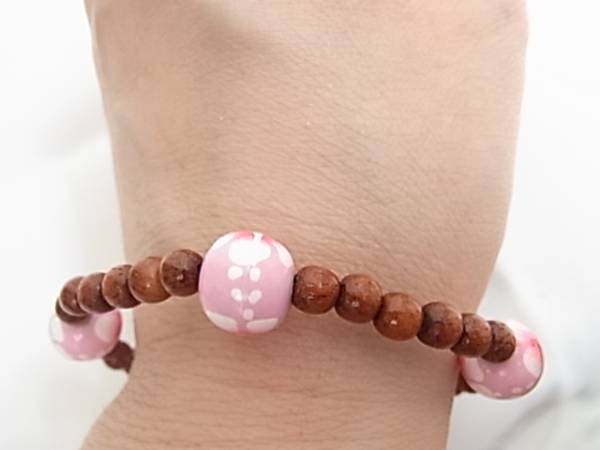 木製ビーズにピンクのストーン珠