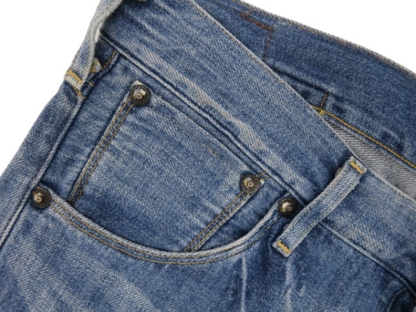 裾は赤耳使用で、ヒップにフラップが付いています。