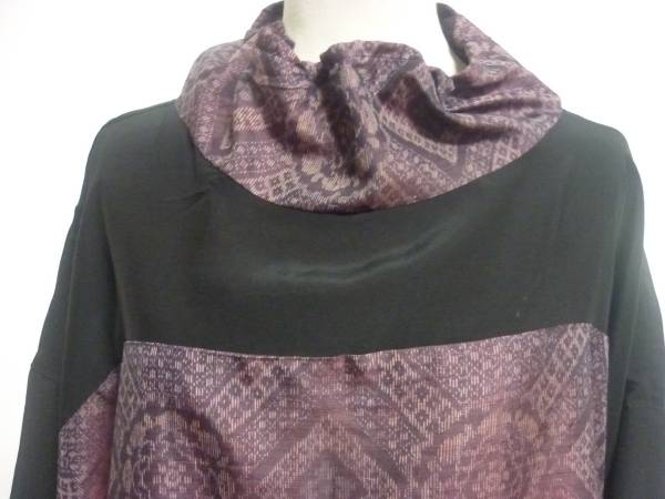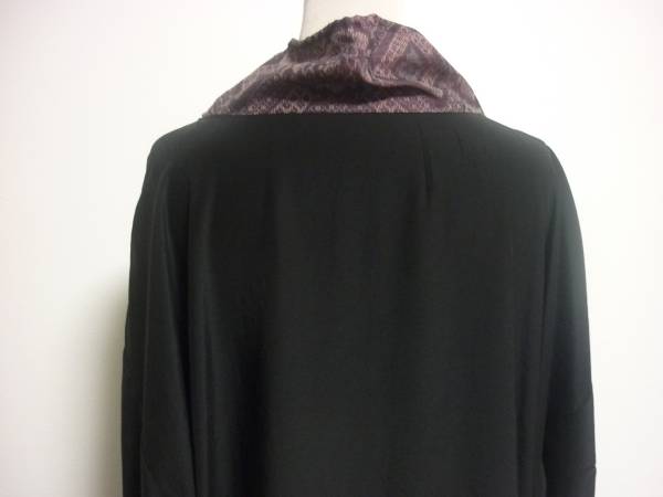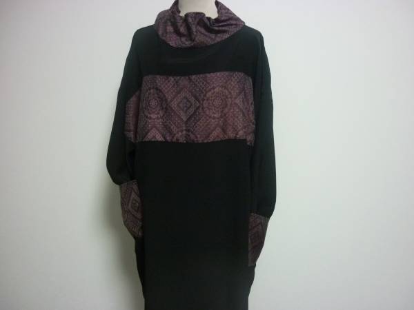 新反、某有名礼服専門店で使用の、絹混(3%程度)のブラックフォーマル生地と大島紬の着物を解いて、割烹着型、スモックワンピースをハンドメイド致しました。実寸は、肩幅68、袖丈38、脇下身幅67、総丈85、袖付け口は31とたっぷりしておりますので、重ね着にぴったりです。