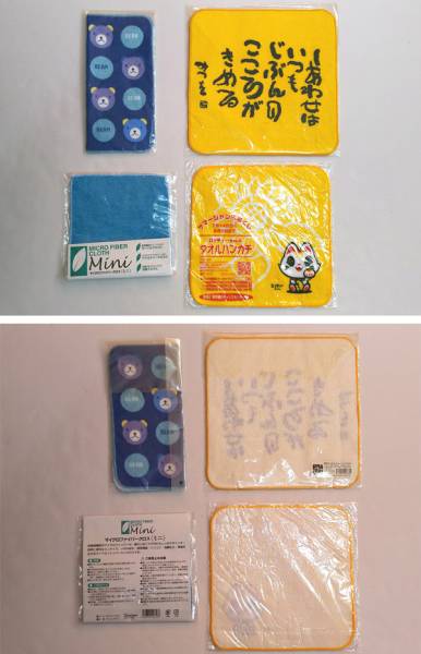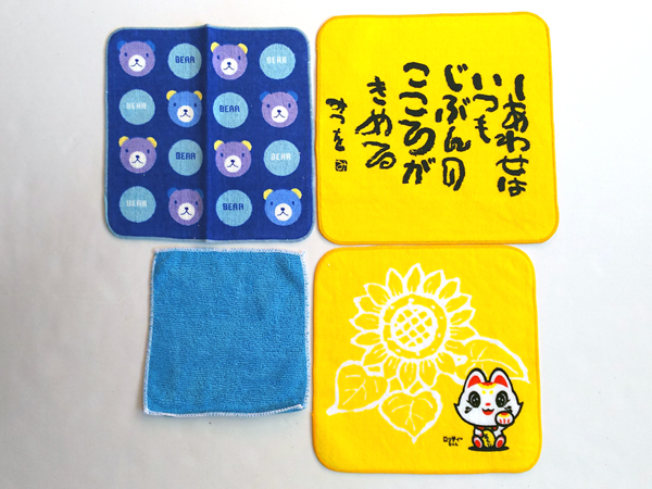 ♪新品未使用♪ハンドタオル4枚セット★黄色2とブルー2★相田みつお・宝くじ(レア)・BEAR・クロスミニ